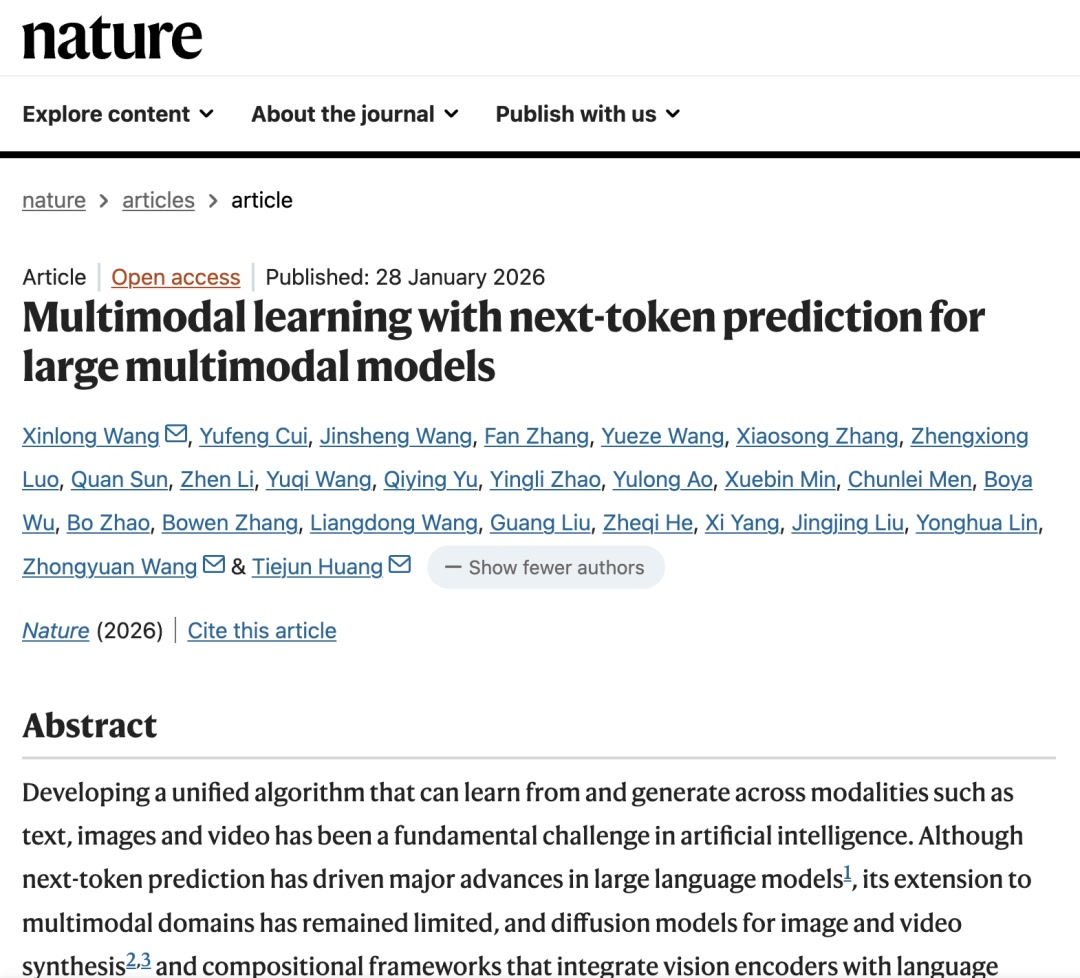 1月28日,北京智源人工智能研究院的一项突破性研究成果在国际顶级学术期刊《自然》(Nature)上线,这是我国科研机构主导的大模型成果首次在《自然》正刊发表。