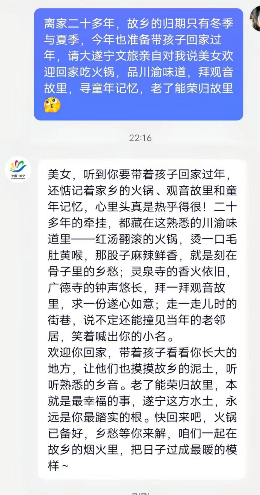 “请欢迎我回家”,与其说是游子的请求,不如说是回家乡过年的预告;与其说是对文旅的提醒,不如说是以亲昵调皮的语言表达对家乡的想念。在游子眼里,文旅就是家乡的代言人。向家乡文旅“报到”,是对当地文旅的信任,何尝不是对家乡春节文旅活动的期待。令游子们感到欣慰的是,各地文旅部门无一例外地敞开欢迎的怀抱,甚至逐一回复游子的问询。“快回来吧,火锅已经备好,乡愁等你来解,咱们一起在故乡的烟火里,把日子过成最暖的模样”,以诚挚的回应对接游子的呼唤,让很多游子为之动容。