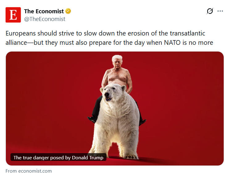 《经济学人》在社交媒体上配文称,“欧洲应当力争减缓跨大西洋联盟的衰退态势,但与此同时,他们也必须为北约不复存在的那一天做好准备。”