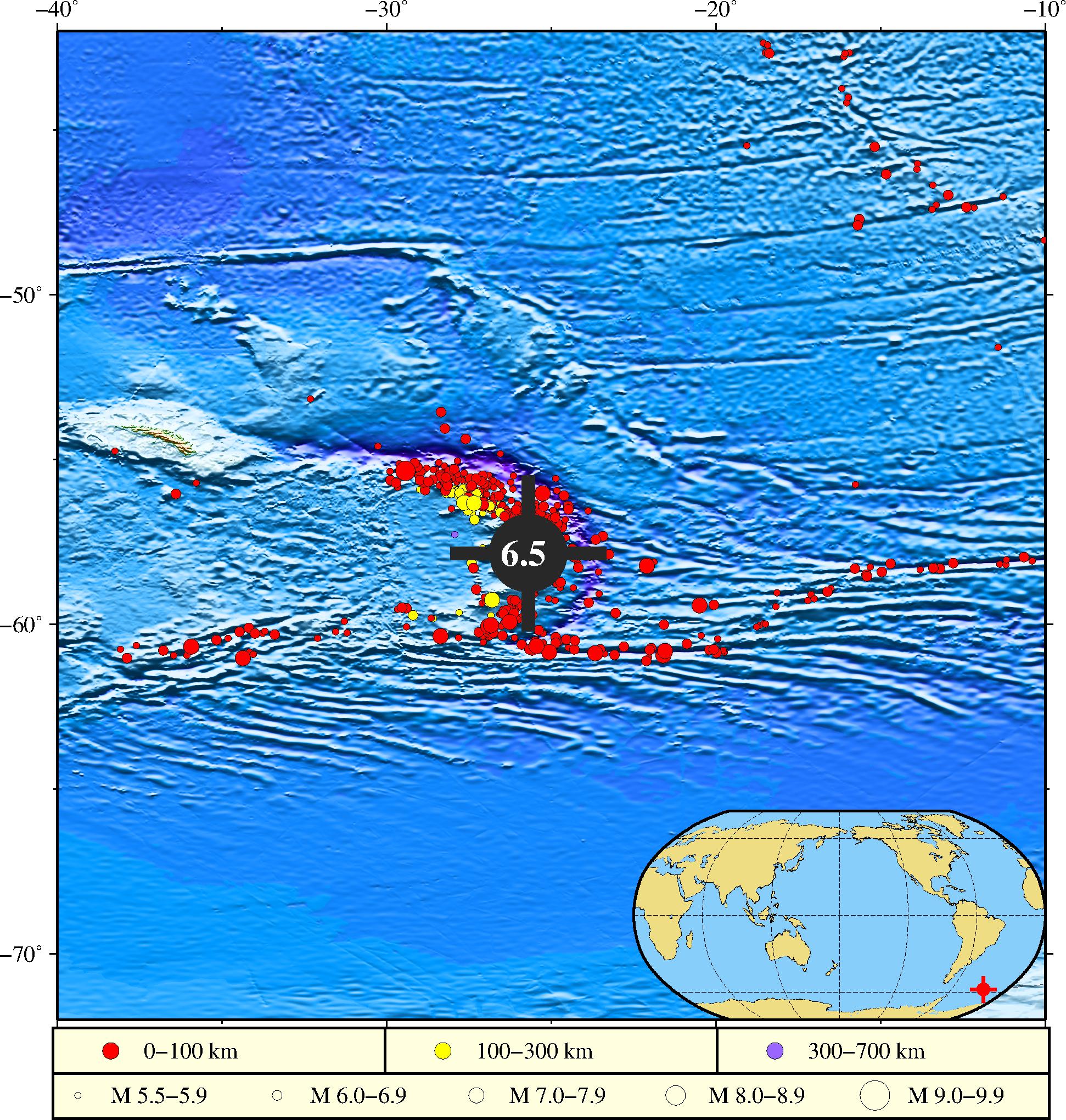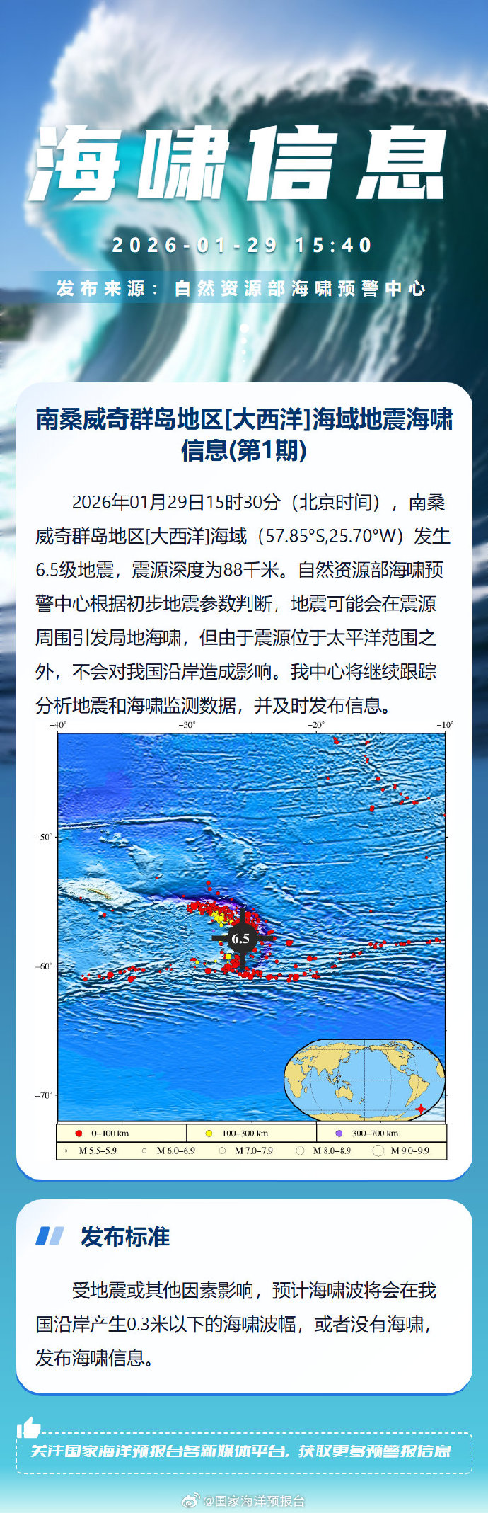 2026年01月29日15时30分(北京时间),南桑威奇群岛地区[大西洋]海域(57.85°S,25.70°W)发生6.5级地震,震源深度为88千米。自然资源部海啸预警中心根据初步地震参数判断,地震可能会在震源周围引发局地海啸,但由于震源位于太平洋范围之外,不会对我国沿岸造成影响。我中心将继续跟踪分析地震和海啸监测数据,并及时发布信息。