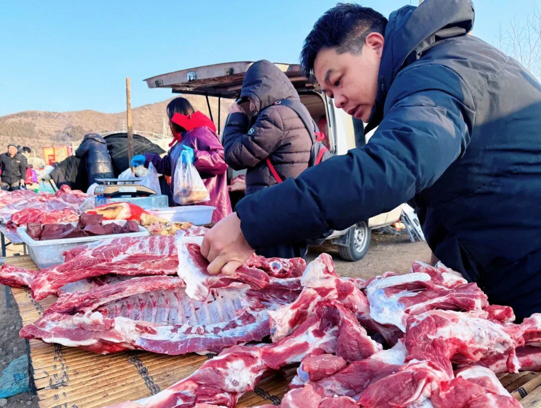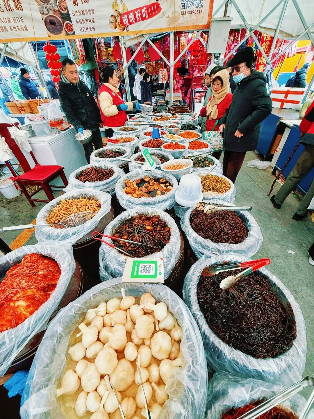 鲁家滩大集的淳朴烟火气,一进来就能感受到!入口处的鲜肉摊早已围满了市民,大家有序购置年夜饭硬菜的首选食材。再往里走,特色豆干摊位让人眼前一亮,五香、麻辣、原味等多种口味任选;刚出锅的卤豆腐热气腾腾;还有现做的挂炉烧饼,咬下一口,酥脆的外皮裹挟着麦香瞬间填满口腔。