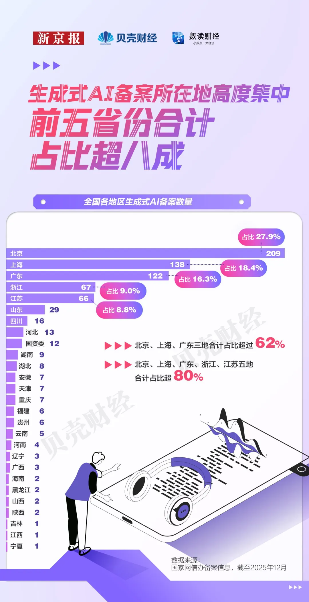 从全国范围来看,北京与广东、上海构成全国生成式AI发展的核心矩阵,三地合计占比达到62.7%。江苏、浙江占比接近,两省份依托完善的制造业基础、数字经济环境以及活跃的民营科技企业,形成较为稳固的生成式AI产业支撑。