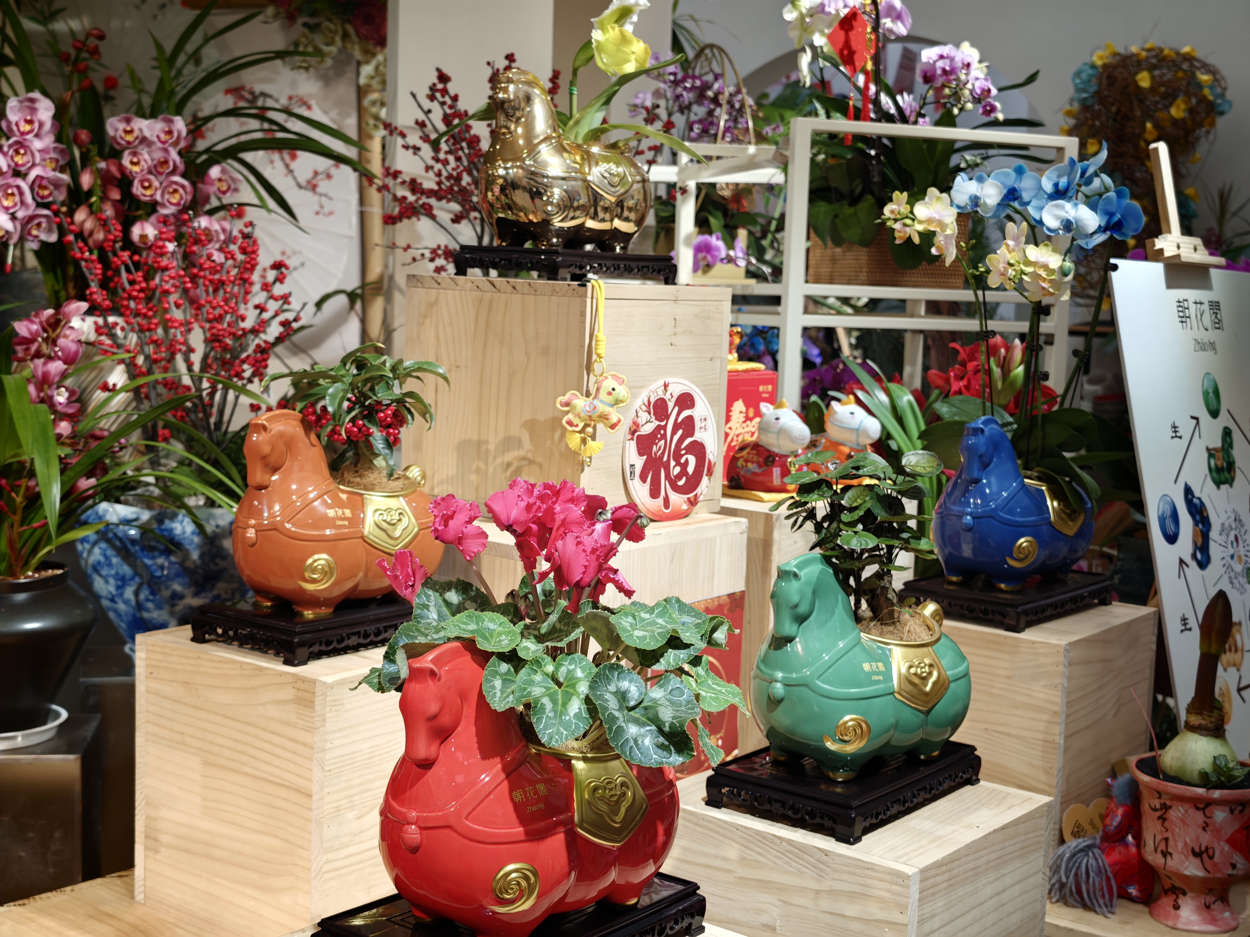 走进北京花卉交易中心,一组“五花马”文创花器成为国潮年礼新宠。花器之上,各色年宵花粲然绽放,与骏马造型相映成趣,寓意“五骏成阵,花开盛世”的美好愿景。