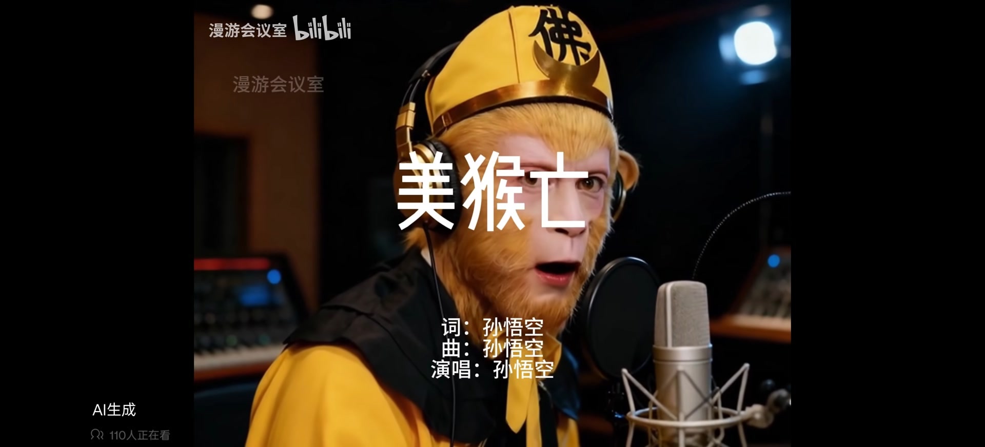 《差一点》以《西游记》中黑熊精的口吻演唱。视频画面中,盗取袈裟失败的黑熊精头上顶着耳机,对着收音麦克风,用有欧美范儿的律动感慨自己的境遇。《西游记》原著中的一个小配角竟然唱出了自己的“主题曲”,充满张力的画面左下角还明确写着——“AI生成”,网友一下炸了锅,一边感叹AI技术的发展,一边由衷称赞《西游记》这个传统文化IP也如此有现代生命力。“漫游会议室”迅速涨粉,并很快推出《美猴亡》等20余首以《西游记》为主题的人物歌曲,其中最受关注的《美猴亡》,截至目前在B站拥有近1664万的点击量,且在持续上涨。