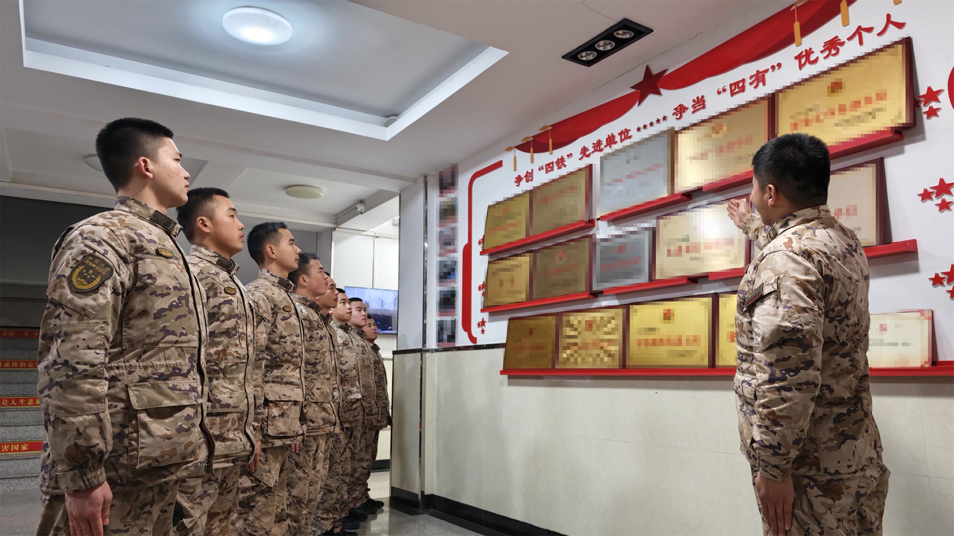 机动某大队将队史教育作为新兵下队“第一堂课”,组织新兵参观荣誉室,重温建队以来的光辉历程。荣誉墙上,一面面奖牌、一张张老照片,记录着历代官兵的奋斗足迹。新兵们驻足凝视,认真聆听干部骨干讲述荣誉背后的故事,在红色基因浸润中强化集体认同,坚定建功军营的信念。