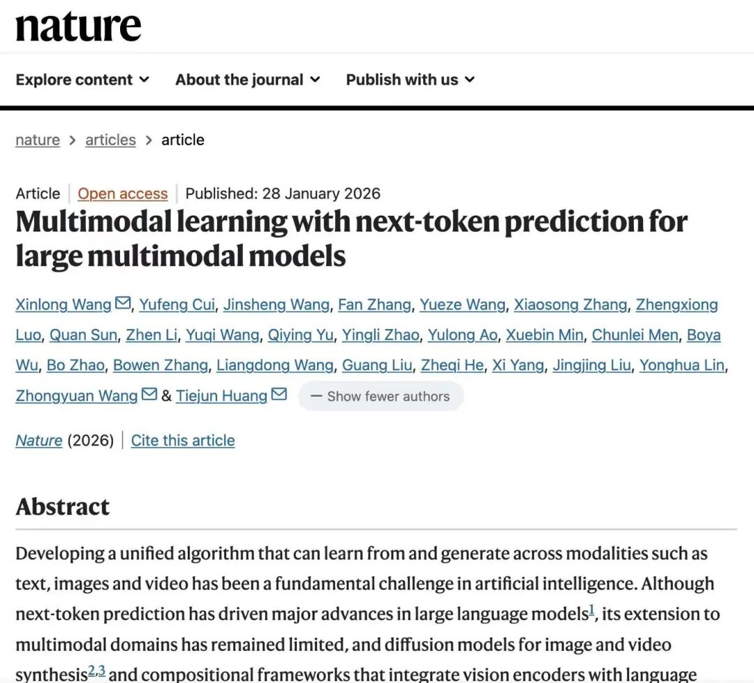 1月28日,智源多模态大模型成果“通过预测下一个词元进行多模态学习的多模态大模型”上线国际顶级学术期刊《自然》(Nature),预计2月12日纸质版正式刊发,这是我国科研机构主导的大模型成果首次在《自然》正刊发表。