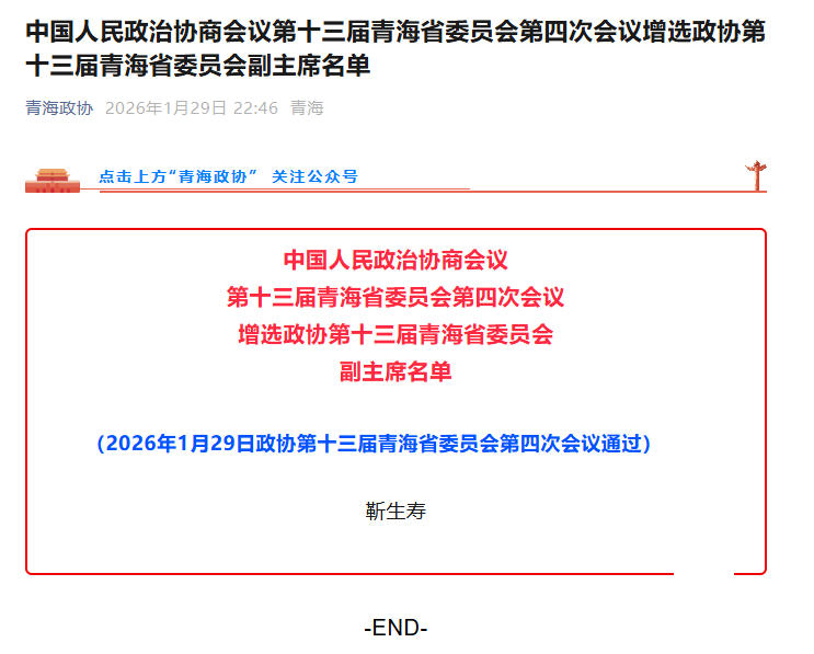 1月29日下午,青海省政协第十三届四次会议举行第三次全体会议,会议增选靳生寿为政协第十三届青海省委员会副主席。