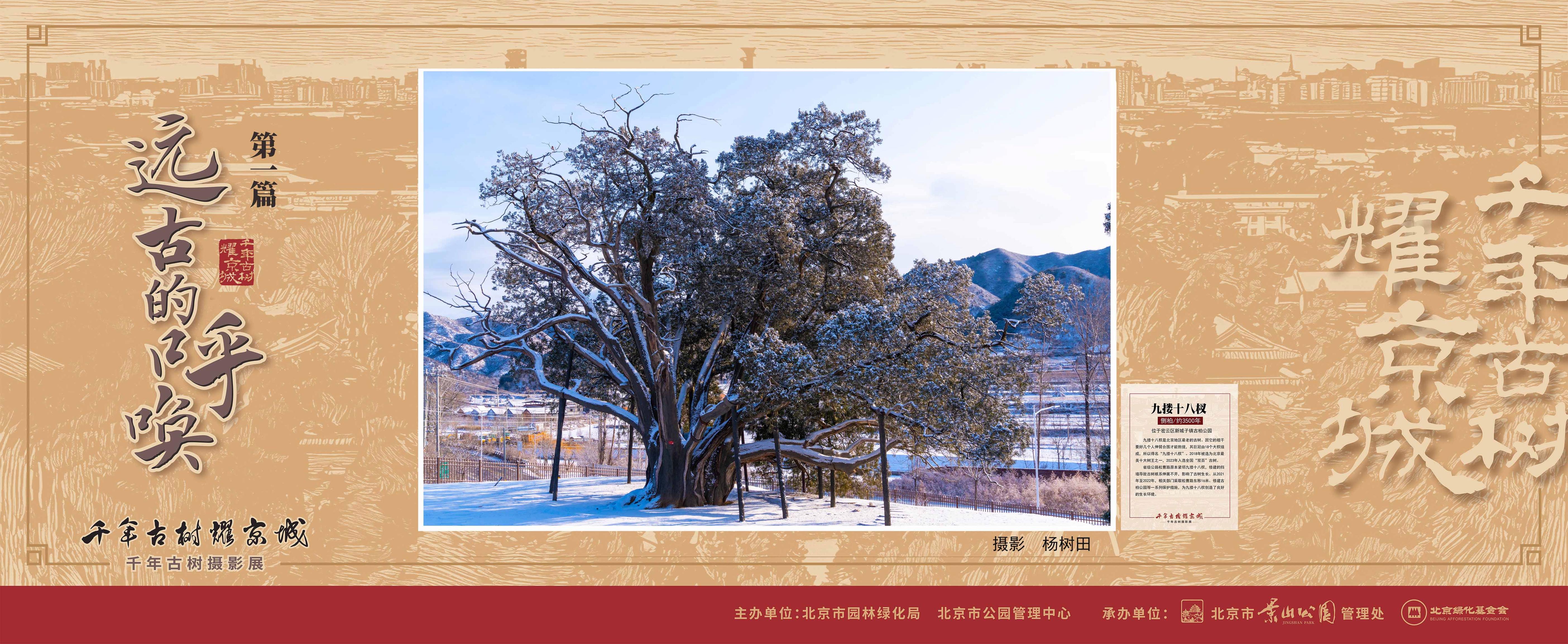 第一篇章中的一幅题为《九搂十八杈》的作品,摄影师捕捉到位于密云区新城子镇古柏公园中的一棵距今约3500年侧柏。这棵侧柏是北京地区最老的古树。因它的树干粗到需要好几个人伸臂合围才能抱拢,其巨冠由18个大杈组成,所以得名“九搂十八杈”。2018年被选为北京最美十大树王之一,2023年入选全国“双百”古树。据称当年省级公路松曹路原本紧邻“九搂十八杈”,修建的挡墙导致古树根系伸展不开,影响了古树生长。从2021年至2022年,相关部门采取松曹路东移16米、修建古柏公园等一系列保护措施,为“九搂十八杈”创造了良好的生长环境,体现出积极探索、创新实践的守护“绿色记忆”的优秀做法。