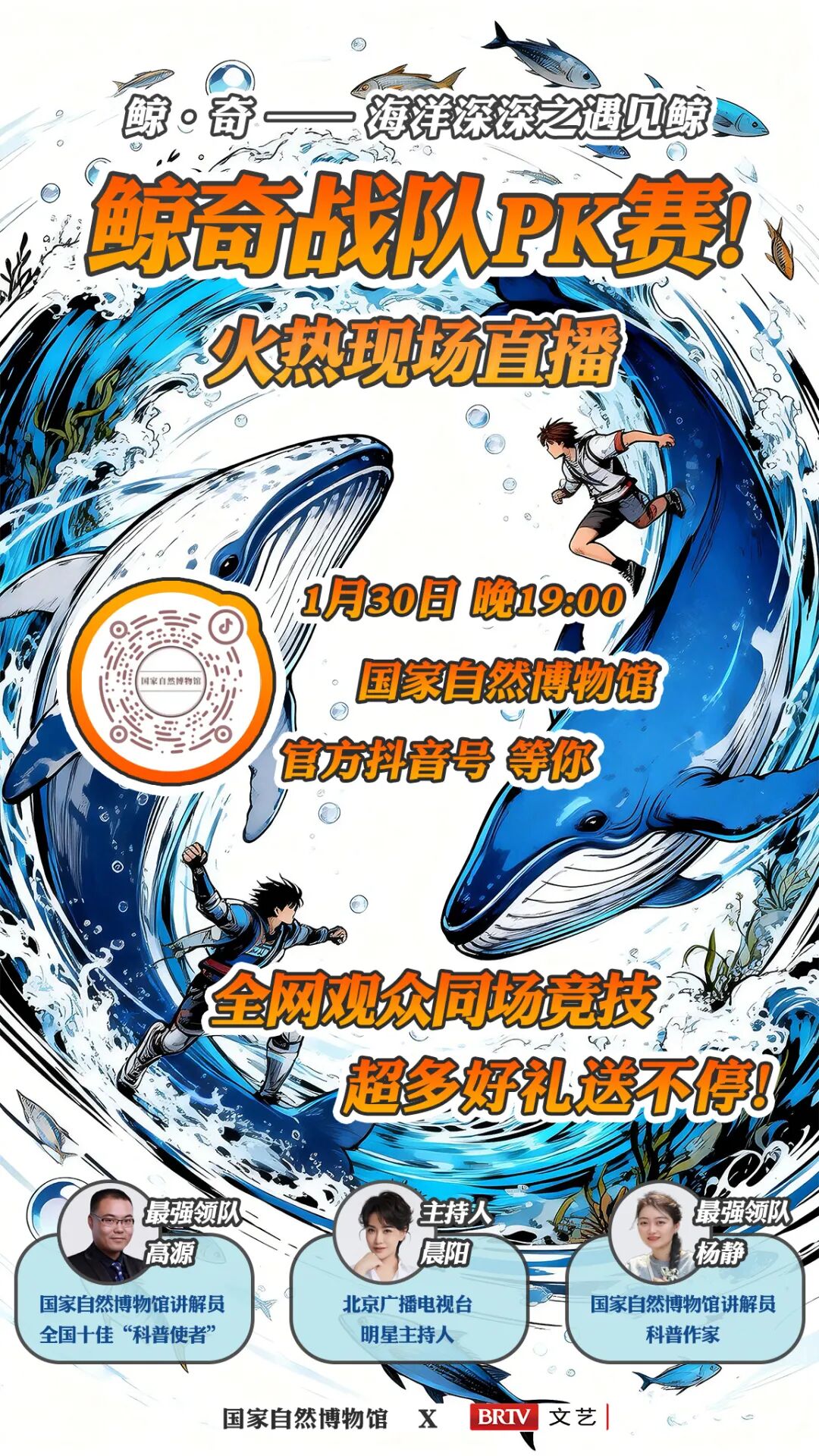 博物馆直播玩出新花样——“鲸·奇”特展战队PK赛来啦!两位馆方优秀科普老师带队,两位家长“替子出战”,搭配北京广播电视台明星主持人晨阳,解锁沉浸式场景头脑手脚大PK!