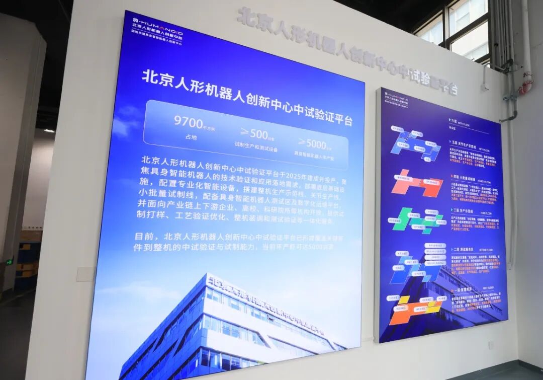 北京人形机器人创新中心中试验证平台占地9700平米,于2025年建成并投产,面向产业链上下游企业、高校、科研院所等机构开放,提供试制打样、性能工艺验证、工艺优化、功能模块装调、整机装调、测试验证六大功能一站式服务。