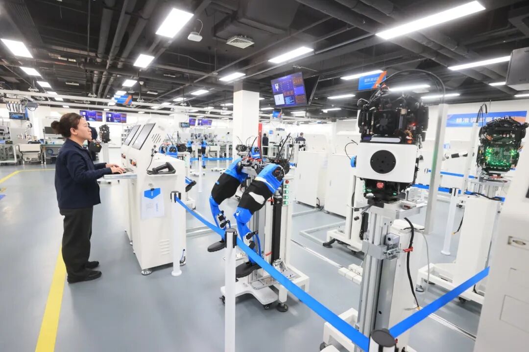 走进该平台,AGV(自动导向车)小车从立体化仓库搬运物料乘梯送至产线,组装、测试等各工序协调配合,平均1小时可以完成一台机器人的整机组装……该平台作为一个集“试制、验证、优化、测试”功能于一体的现代化产业服务平台,构建了四大核心功能载体,包括小批量试制线、具身智能机器人生产示范线、具身智能机器人关节生产示范线及专业测试实验室,可实现从核心部件到整机的全链路中试服务覆盖。