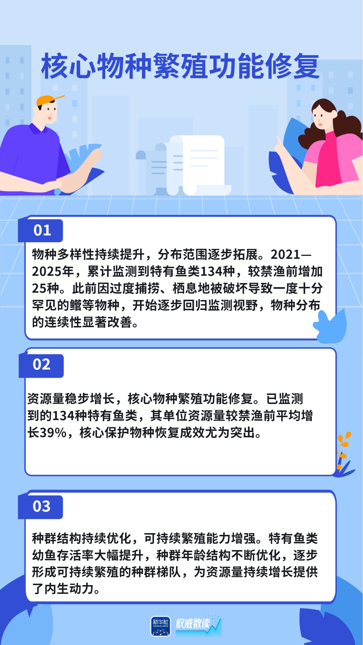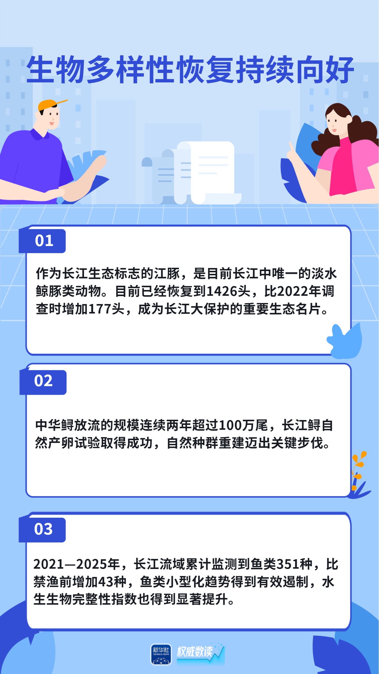 长江江豚数量恢复到1426头,中华鲟放流规模连续两年超过100万尾,长江鲟自然产卵试验取得成功......国新办30日发布会上,农业农村部介绍,长江十年禁渔全面启动实施五年来,取得了阶段性积极进展和显著成效,母亲河长江生物多样性恢复持续向好,逐步重现生机活力。跟随海报,一起来看看吧。