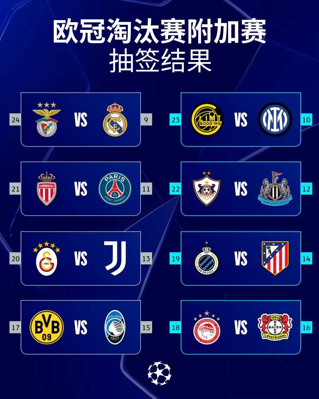 北京时间1月30日晚,本赛季欧冠联赛淘汰赛附加赛抽签仪式在位于瑞士尼翁的欧足联总部进行。联赛阶段排名第9位至第24位的16支球队将为8个晋级资格捉对厮杀,其中西甲豪门、15届赛事冠军皇家马德里队抽到联赛阶段最后一轮的对手葡超本菲卡队(当时皇马客场2比4失利)。上届冠军法甲巴黎圣日耳曼队则将对阵同样来自法甲的摩纳哥队。