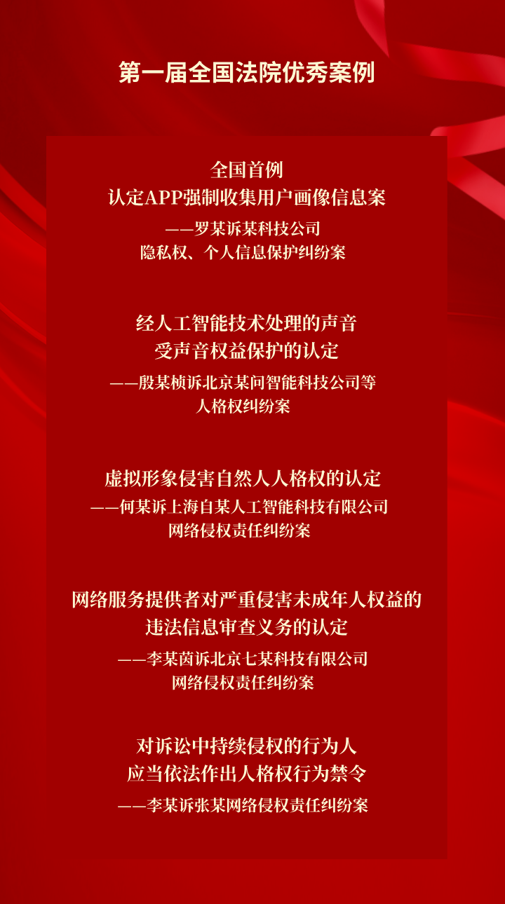 2026年1月29日,最高人民法院发布第一届全国法院优秀案例评选活动结果(点击查看),北京互联网法院“罗某诉某科技有限公司隐私权、个人信息保护纠纷案”(指导性案例265号)、“殷某桢诉北京某问智能科技公司等人格权纠纷案”“何某诉上海自某人工智能科技有限公司网络侵权责任纠纷案”“李某茵诉北京七某科技有限公司网络侵权责任纠纷案”“李某诉张某网络侵权责任纠纷案”成功入选。