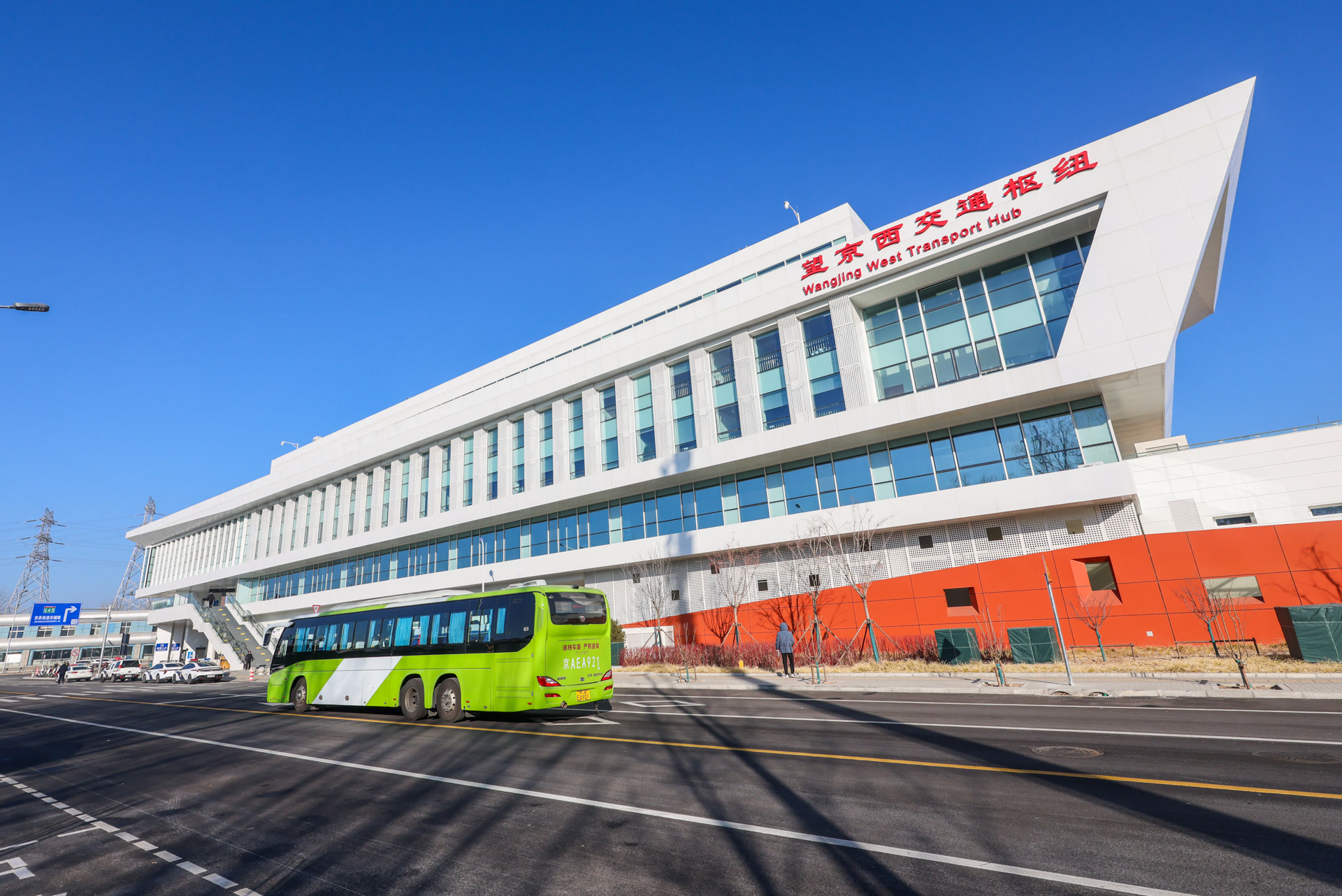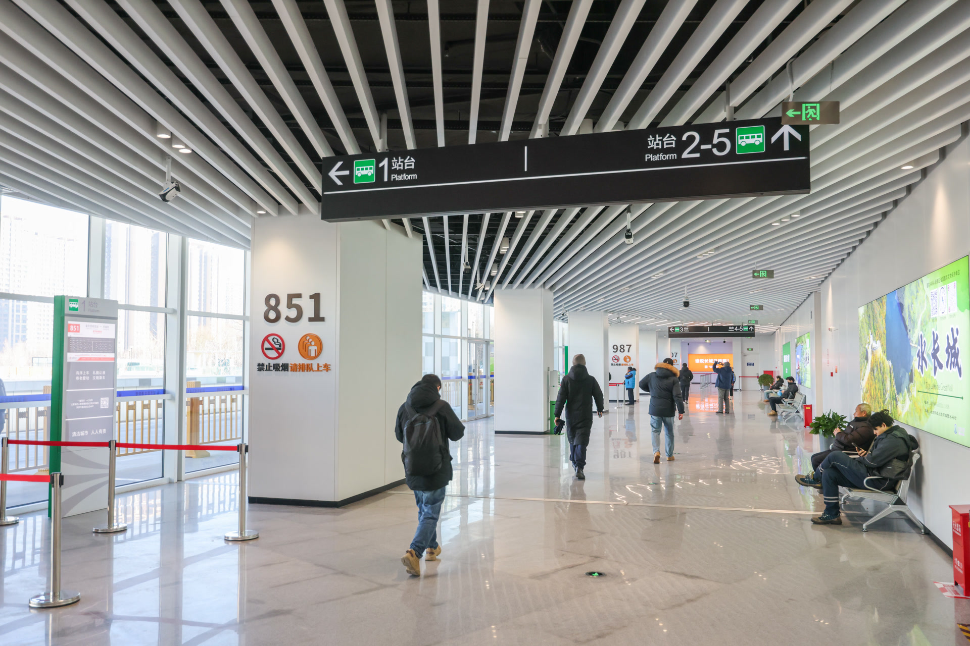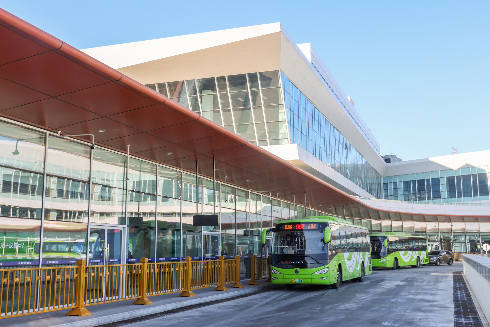 从望京西站E口出站,便来到了当天同步开通的望京西交通枢纽地下层。枢纽装修采用黑白配色,简约时尚又大气。记者注意到,枢纽公交站台共分为两层,乘客搭乘扶梯上一层楼,可以到达夹层,换乘866、571路公交和快速直达专线197路;再上一层即可到达地面层,可换乘907、987、851、854路公交。这两层站台与外界设置了玻璃墙隔离,乘客可以在温暖的室内等候公交。望京西交通枢纽,乘客可以搭乘公交前往密云、怀柔等地。