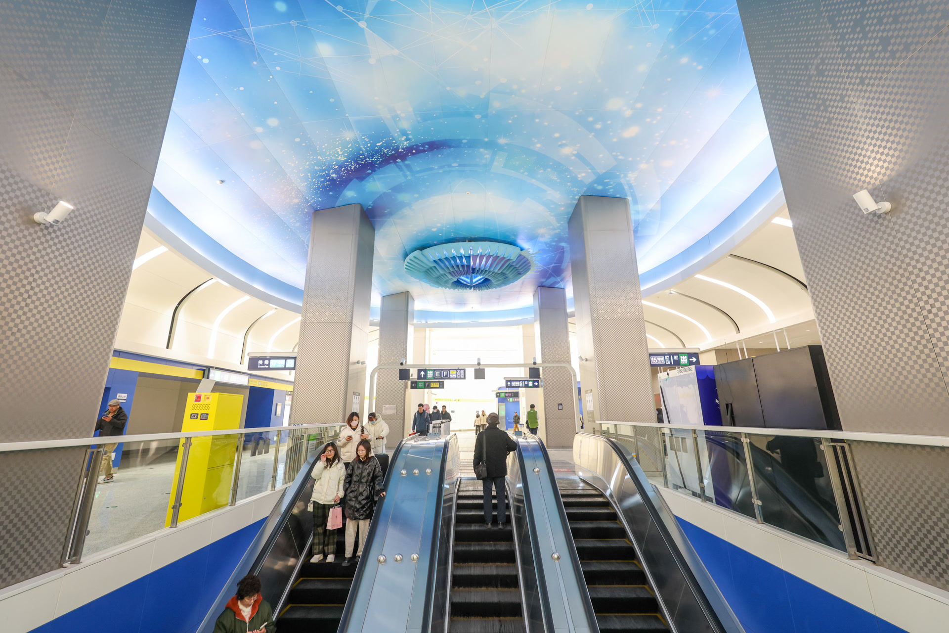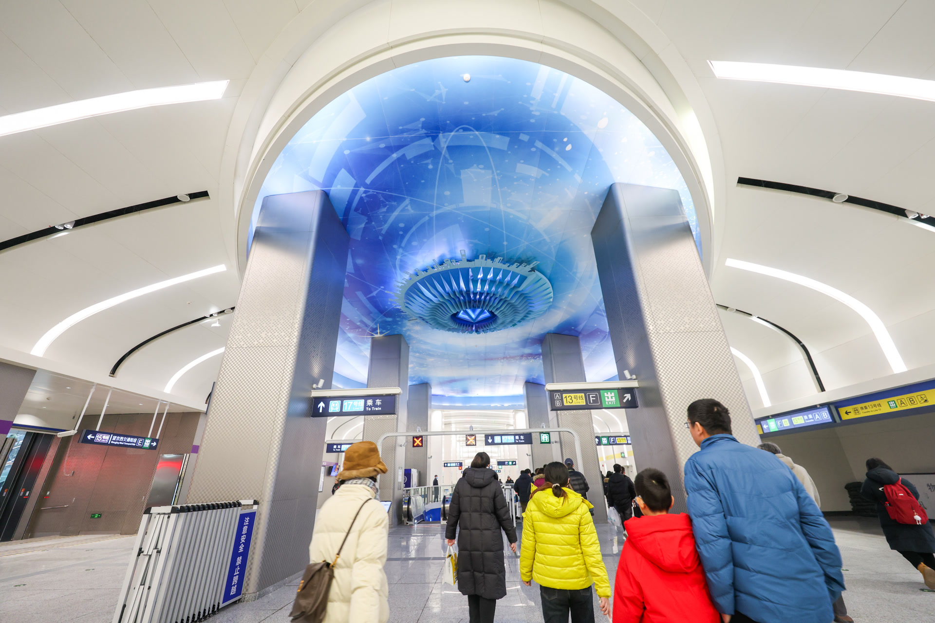 走进新开通的17号线望京西站内,在站厅顶部,一个巨大的“飞碟”悬浮在幽蓝神秘的“宇宙”中,带给人满满科技感。