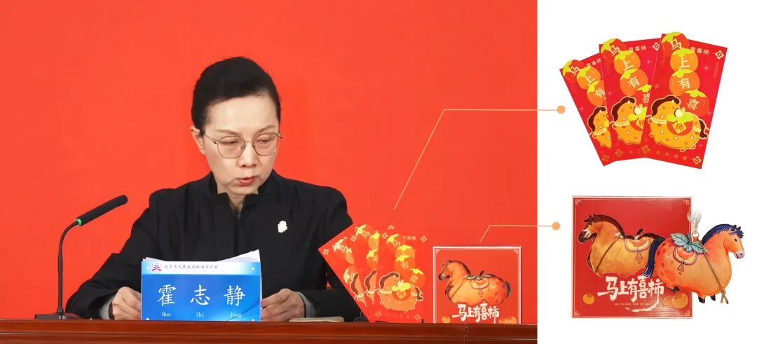 ▲北京市委宣传部副部长、北京市电影局局长霍志静在会上介绍春节文化活动,桌旁陈列的正是老舍纪念馆“马上有喜柿”系列爆款文创——互动抽拉红包与“福柿胖马”香囊挂件。