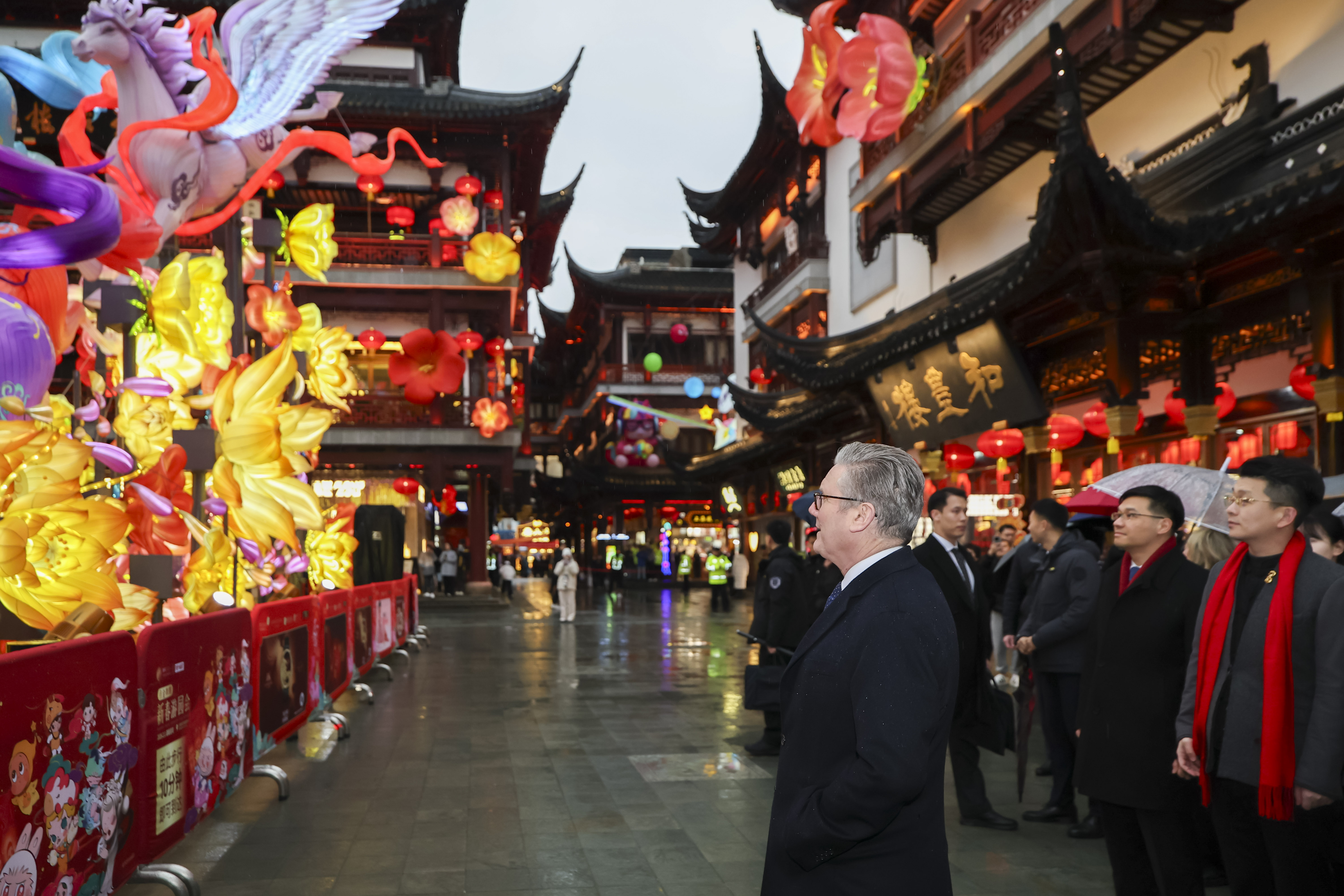 30日下午,斯塔默参观了上海豫园。春节临近,这座始建于明代的古典园林节日气氛浓厚。豫园商圈的中心广场上,以农历马年为主题的灯组依次铺陈,传统灯彩与智能光影交相辉映。参观过程中,斯塔默向工作人员了解“马”在中国文化中的寓意,并购买了上海特产蝴蝶酥。