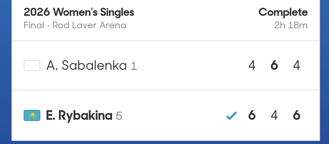 决胜盘,萨巴伦卡连破带保3比0占先,但此后莱巴金娜状态提升连破两局,连下五局后反超比分。第10局,莱巴金娜在发球胜赛局把握住机会,兑现赛点,夺得冠军。萨巴伦卡则是连续两年拿到澳网女单亚军。