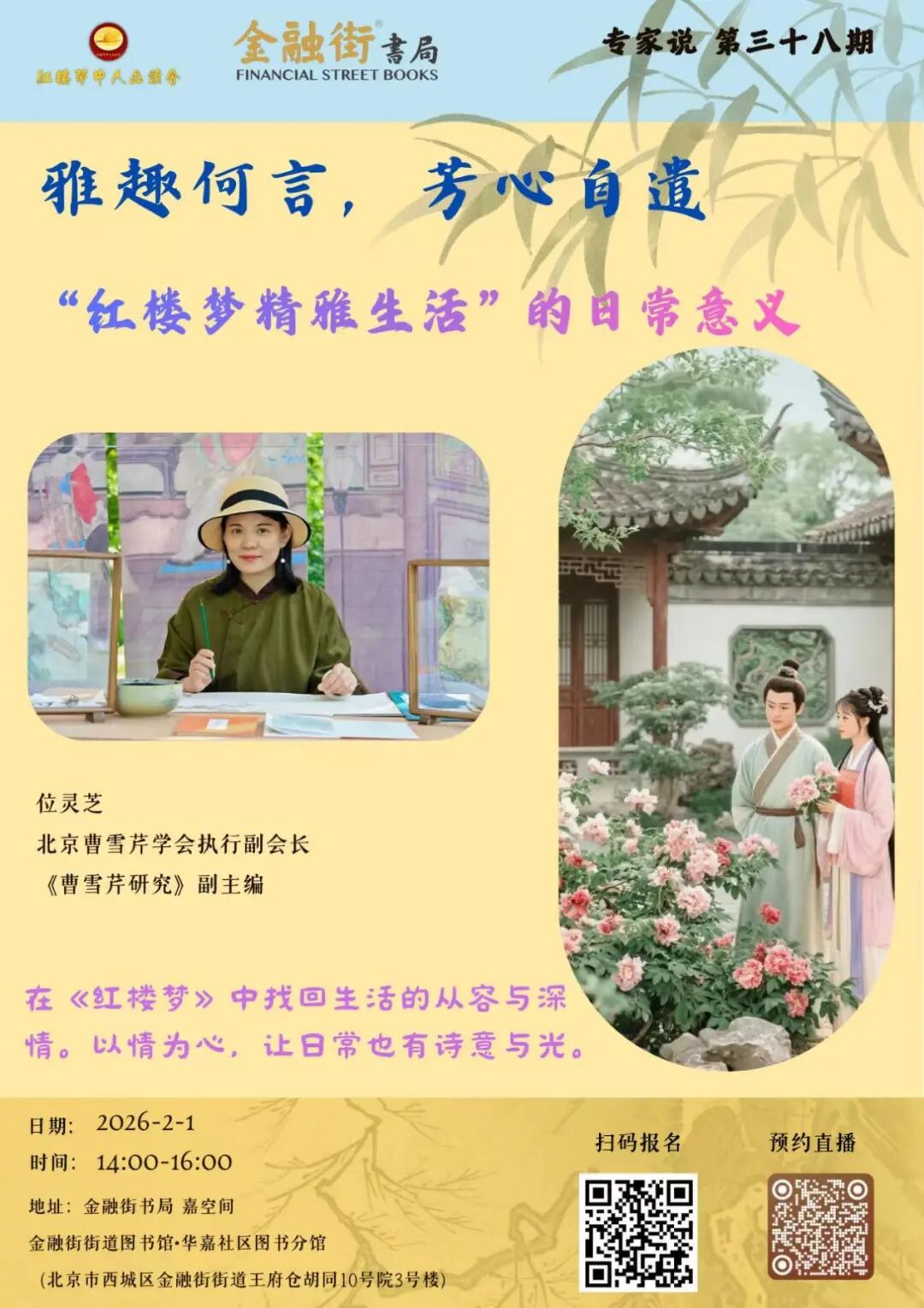 若说《红楼梦》是一本“生活美学指南”,您信吗?2月1日14点,在金融街书局·嘉空间,北京曹雪芹学会执行副会长位灵芝老师会带您拆解《红楼梦》里的“精雅日常”:姑娘们的茶会、案头的笔墨、檐下的花事……这些藏在字里行间的细腻,恰是当代人找回“生活从容感”的钥匙——原来一茶一饭、一书一画,都能晕染出诗意的底色。