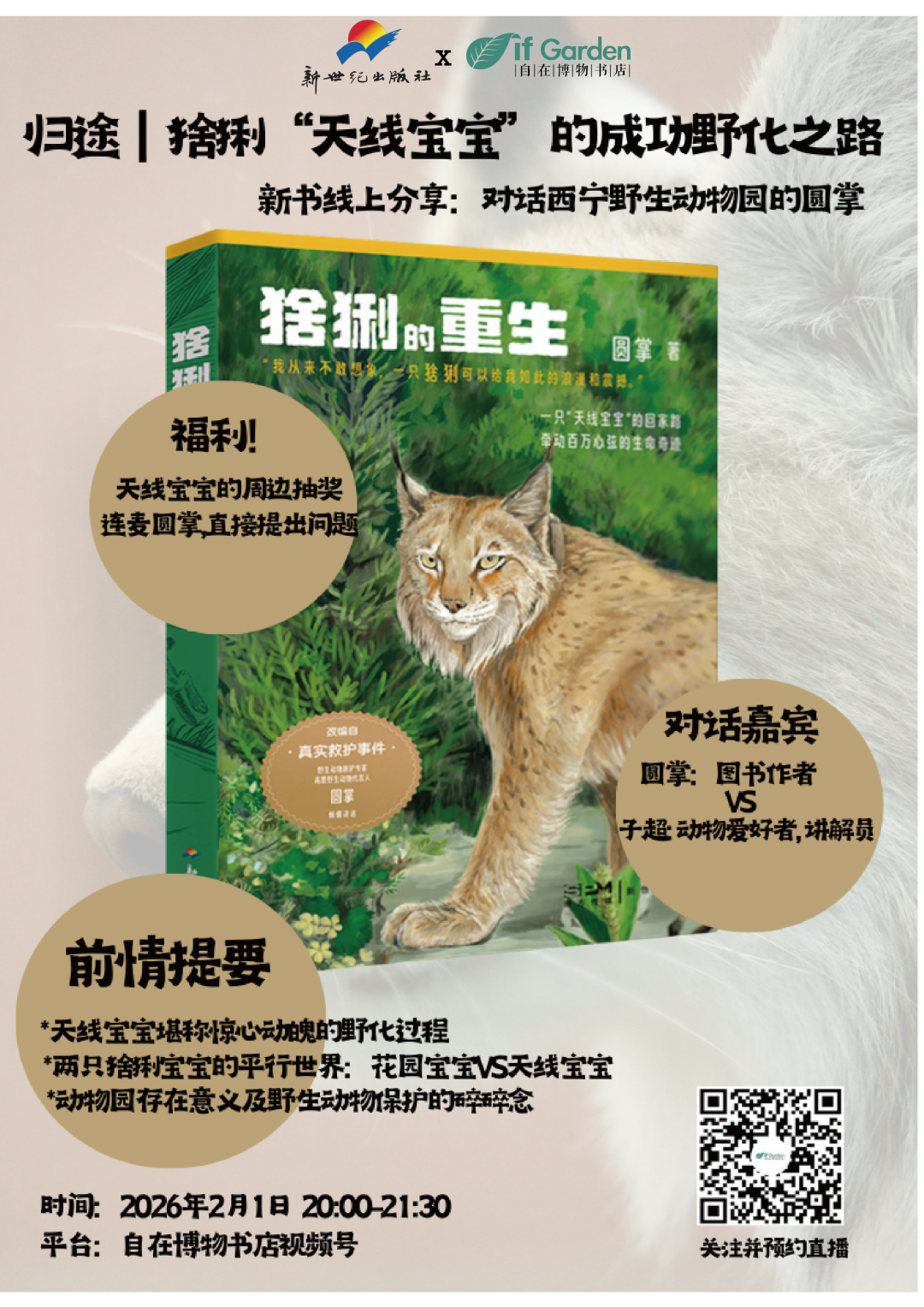 20点,打开自在博物书店的直播间,听《猞猁的重生》作者圆掌讲“天线宝宝”的故事:这只曾受伤的猞猁,如何从动物园重返山林?当它的“平行世界”遇上另一只猞猁“花园宝宝”,你会读懂:自然的书页里,每段生命都写着“韧性”。