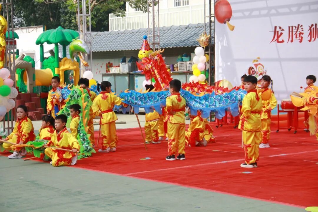 北务镇的小学及幼儿园学生表演龙狮舞。