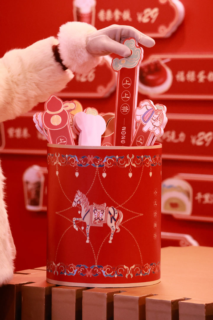 沉浸式互动是快闪店的亮点,许多游客手上都拿着一款“马年上上签”杯子,在店门口拍照打卡。角楼咖啡工作人员介绍,杯子外观设计取材于故宫博物院藏文物清代掐丝珐琅七珍中的“胜马宝”。这匹马昂首阔步,周身有祥瑞缠枝点缀,寓意“马到吉祥”。菜单也是马年限定,比如“苹”安拿铁、“柿柿”如意奶茶等。杯套还隐藏了抽签设计,“马上有福”“马上如意”“马上发财”等多种吉祥签语随机出现。