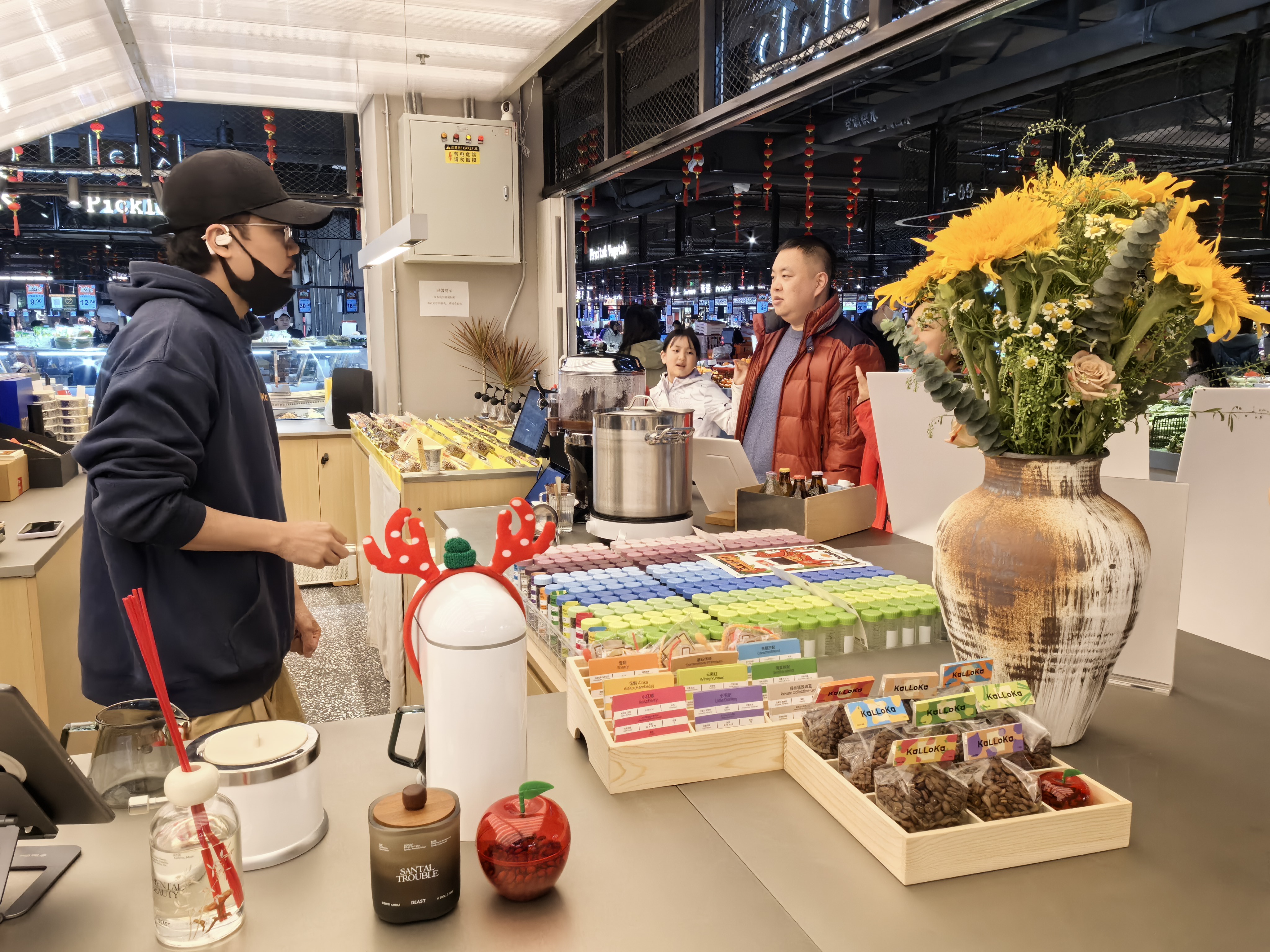 柒号市集是一家新开的菜市场,面积超大,通透明亮。咖啡店并不难找,它只有约10平方米,是开放式的,桌上的大陶瓶里插着金黄的向日葵。咖啡师在吧台里忙碌,周边围着一圈儿座椅,除了售卖各种咖啡、咖啡豆,还有煮红酒和热巧克力。