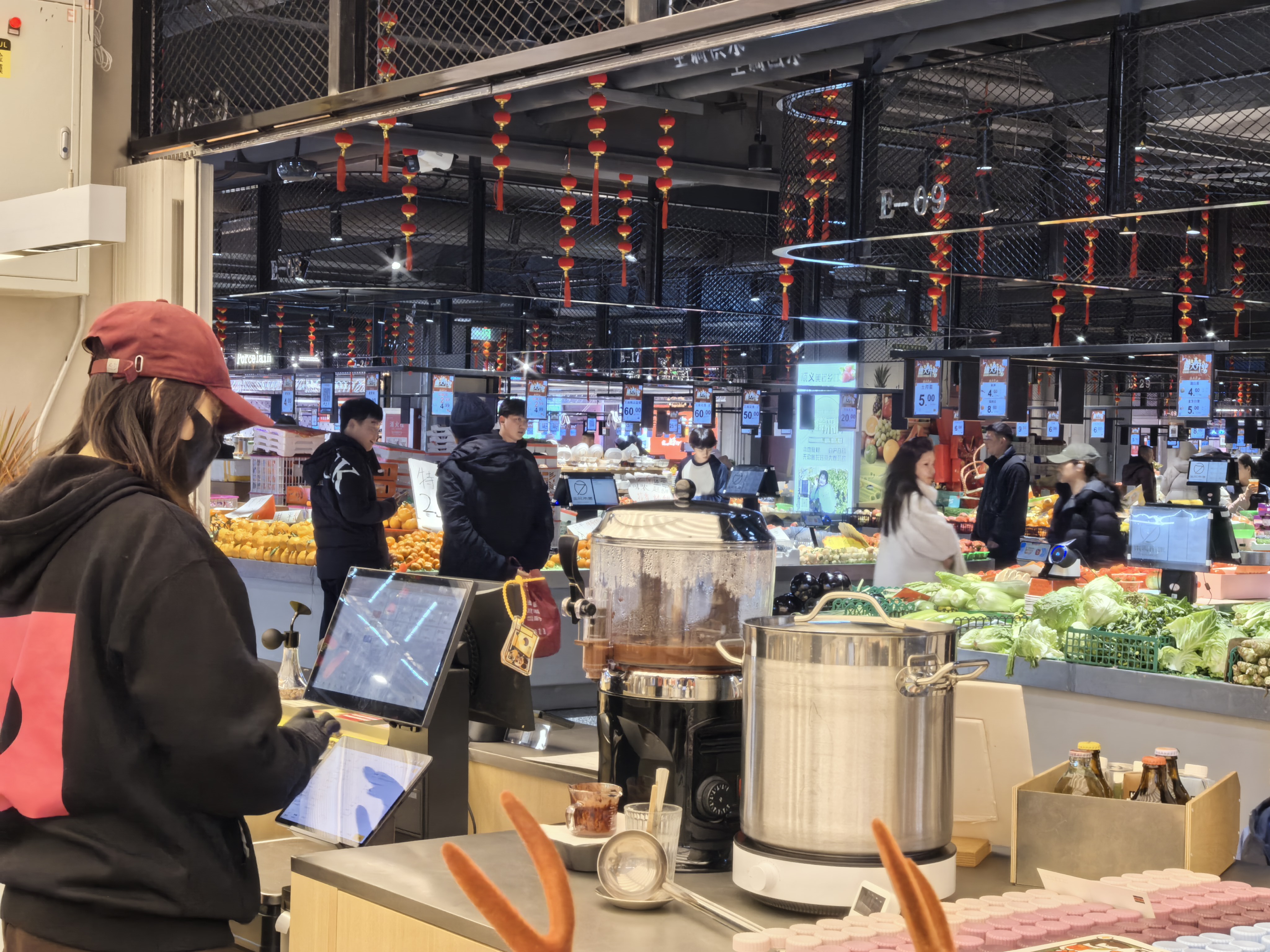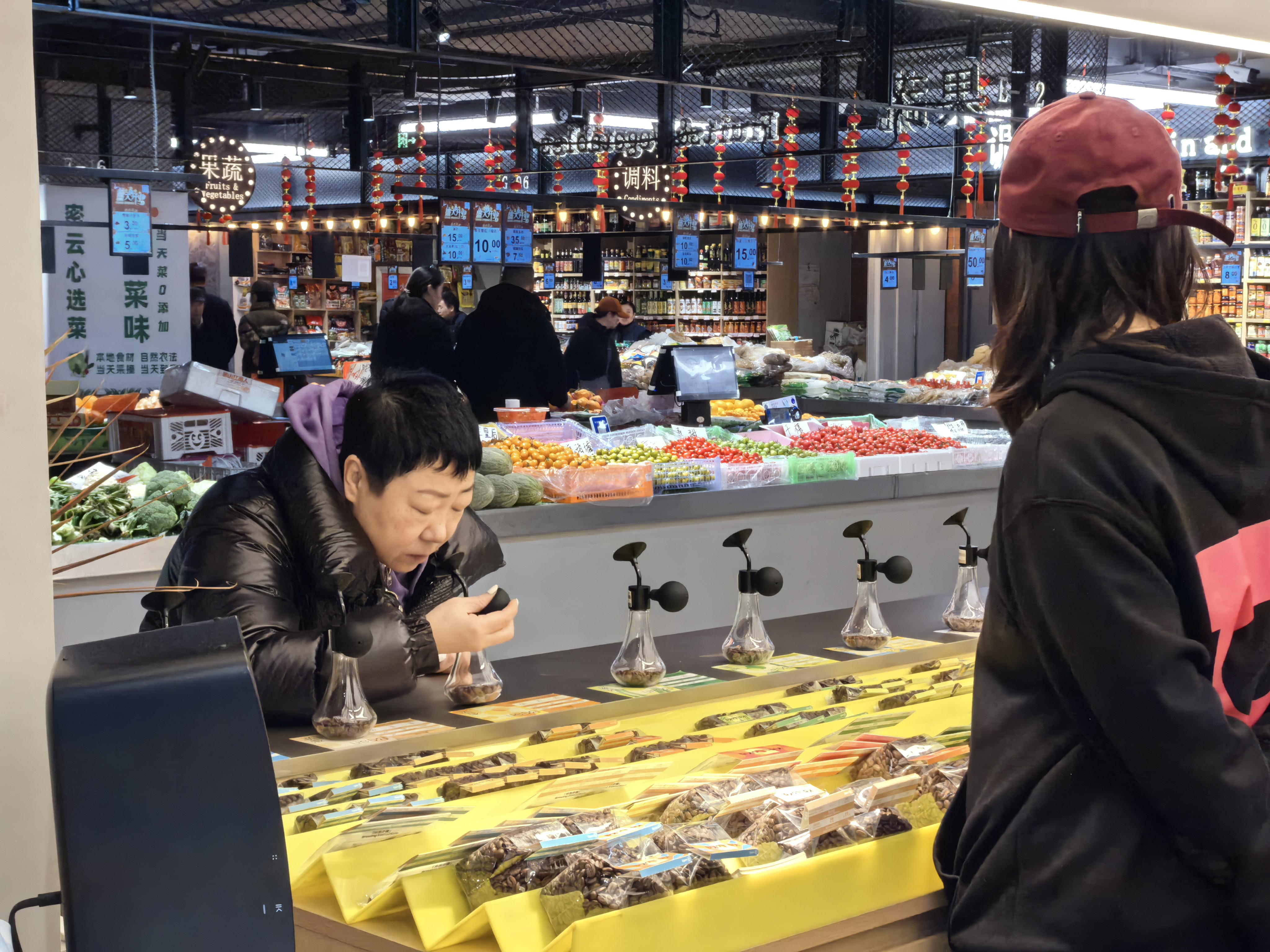 咖啡店被琳琅满目的肉菜水果包围着:玛瑙珠一般的水果番茄,个大色亮的青红椒,布满漂亮大理石纹的三文鱼……都让人感受到热气腾腾的生活之美。咖啡店也希望跟菜市场有更多连结,“比如我们的老北京热红酒,香料和水果都是在周围商户那儿采买的。”咖啡店负责财务工作的卢华介绍。