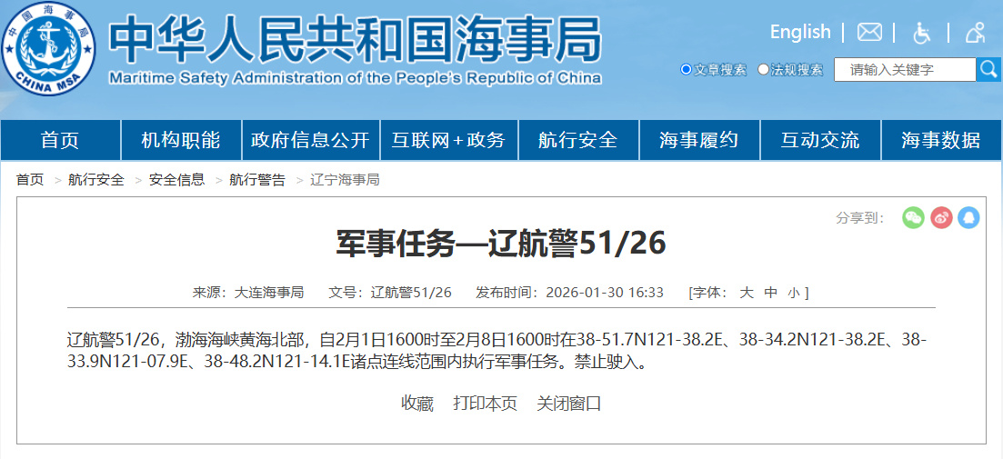 据中国海事局网站消息,大连海事局发布航行警告,2月1日16时至2月8日16时,渤海海峡黄海北部部分海域执行军事任务,禁止驶入。