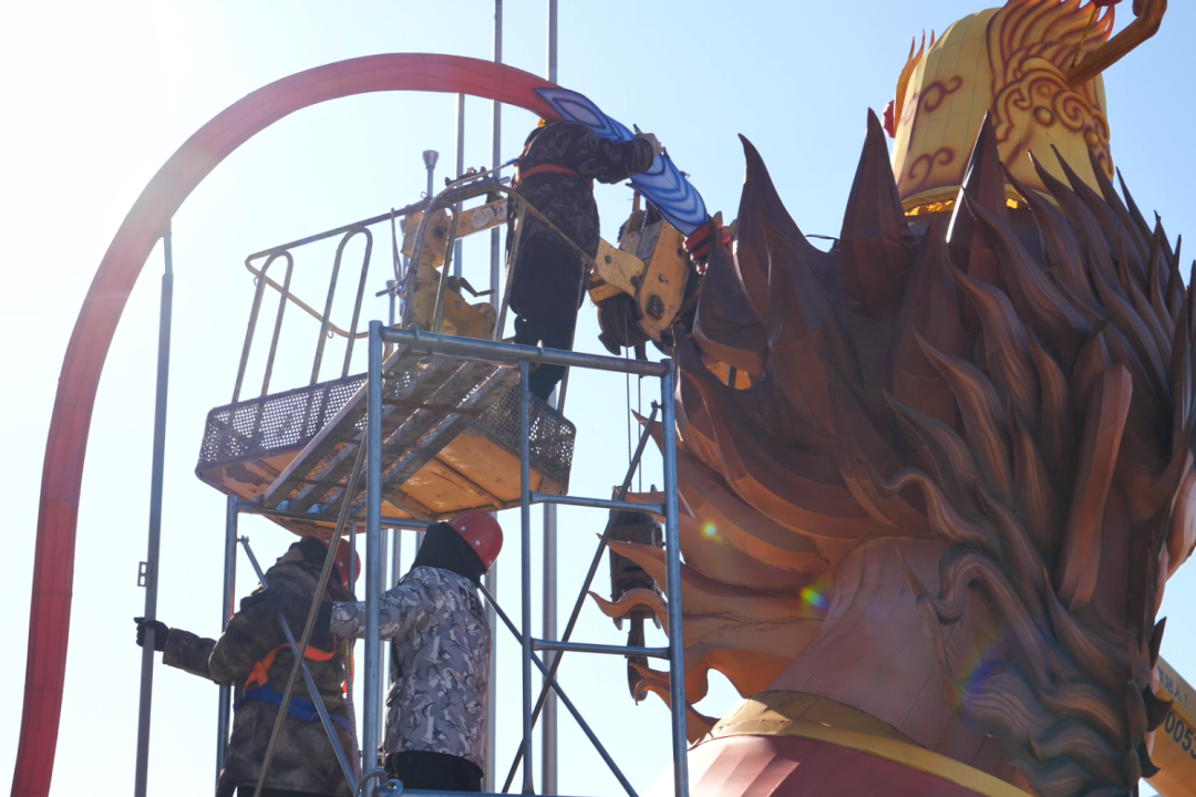 走进园区,处处都是忙碌的节奏,数十名工匠师傅各司其职、精益求精。巨型灯组组件被高空吊车缓缓吊起,工作人员精准安装、固定结构。地面上,施工团队分工协作,拼接灯组骨架、打磨灯饰细节、调整造型位置……在他们的努力下,新春灯海的美好轮廓慢慢清晰。