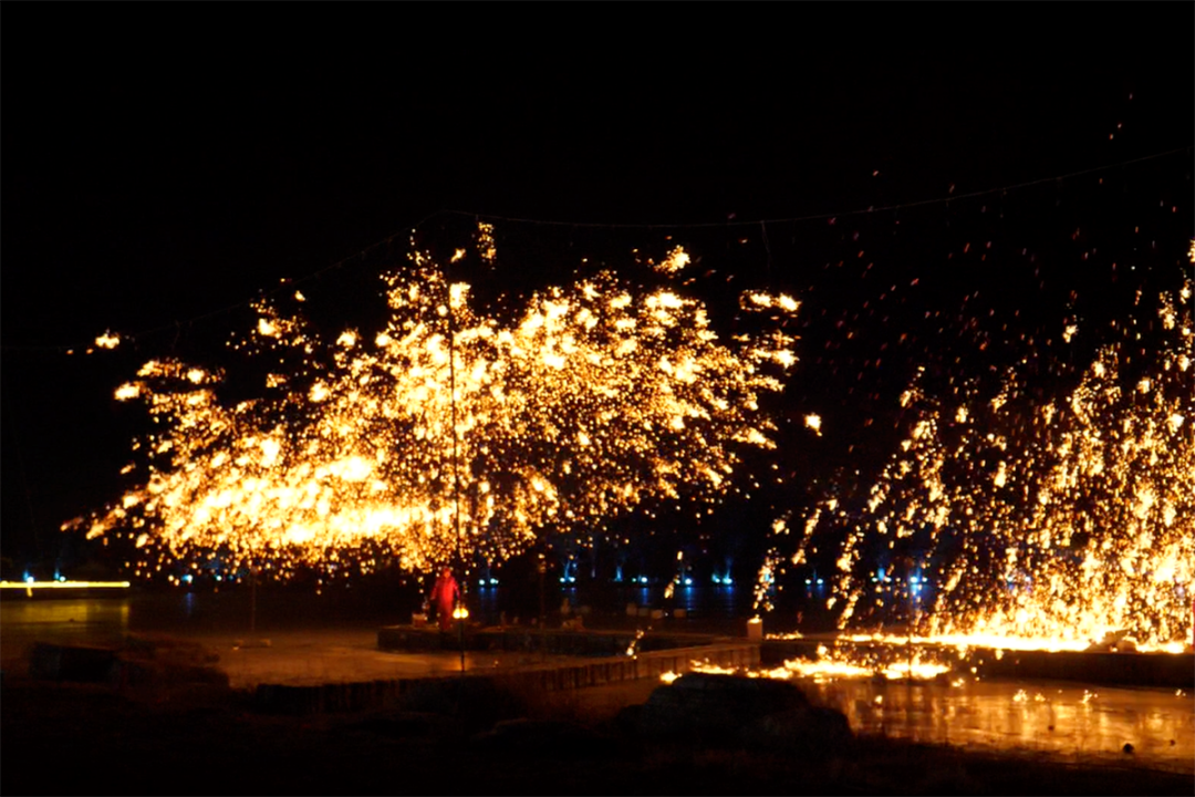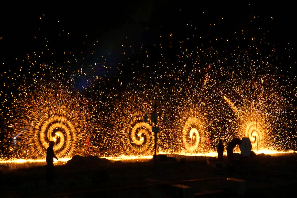 非遗“打铁花”“风火轮”表演。(资料图)