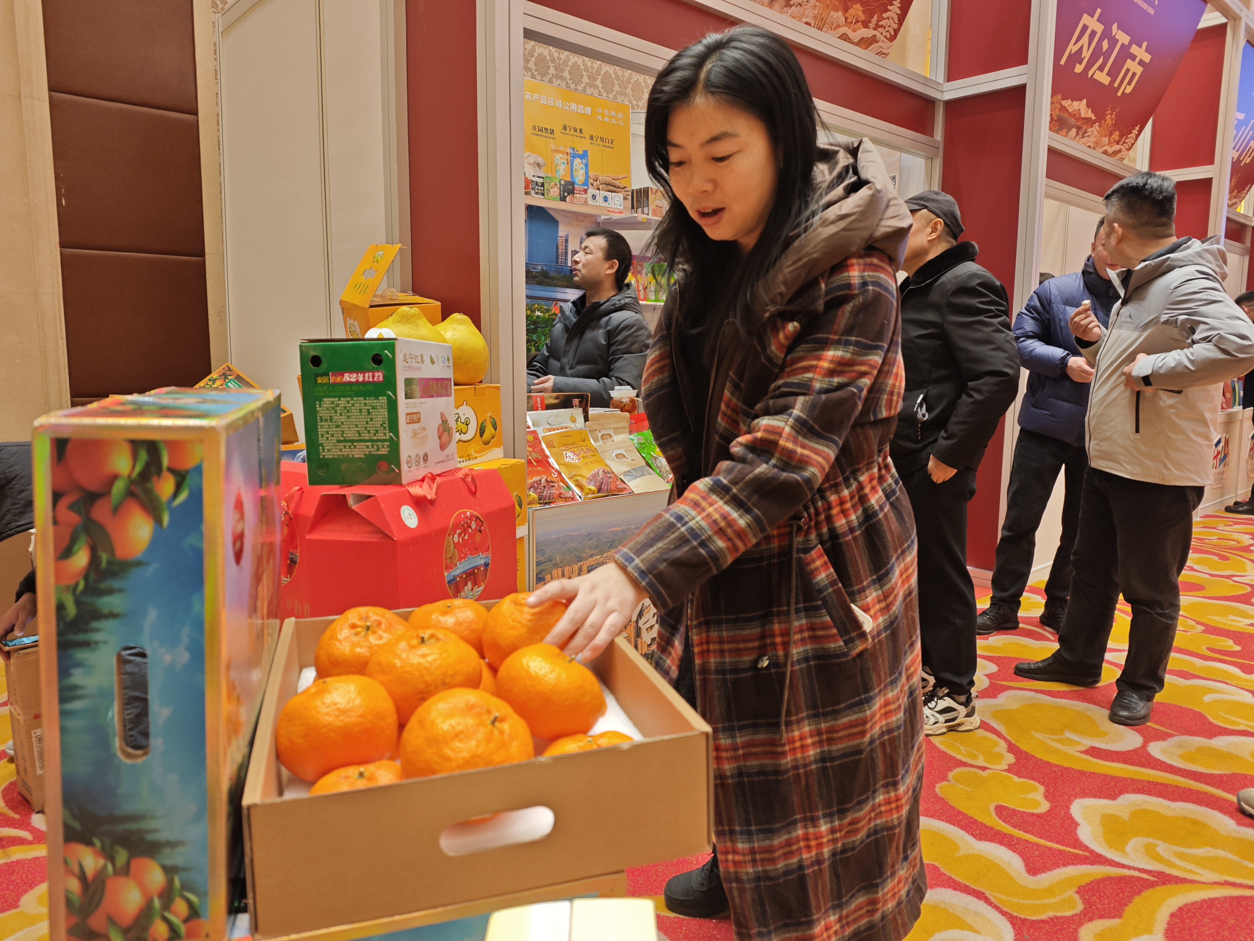 在遂宁市展台上,一款柑橘引人关注。这款柑橘个头较大,单手只能抓起一个,重量超过0.5公斤。据了解,这款名曰“甘平”的柑橘是新晋培育出的高端品种。一颗甘平,凝聚乡村振兴的力量。遂宁市射洪市通过“公司+基地+农户”模式,让甜果子变身村民“甜日子”,产品正在持续深入京津冀、长三角、珠三角等地的高端市场。