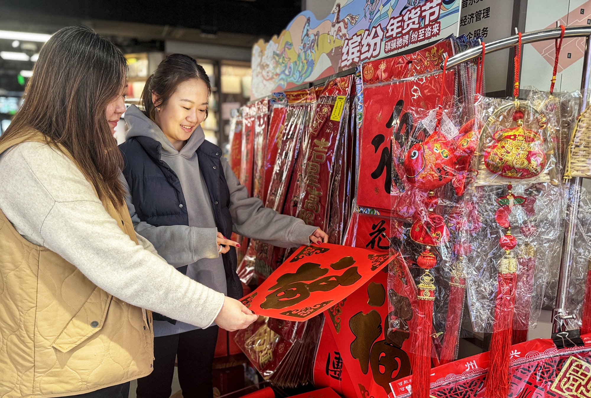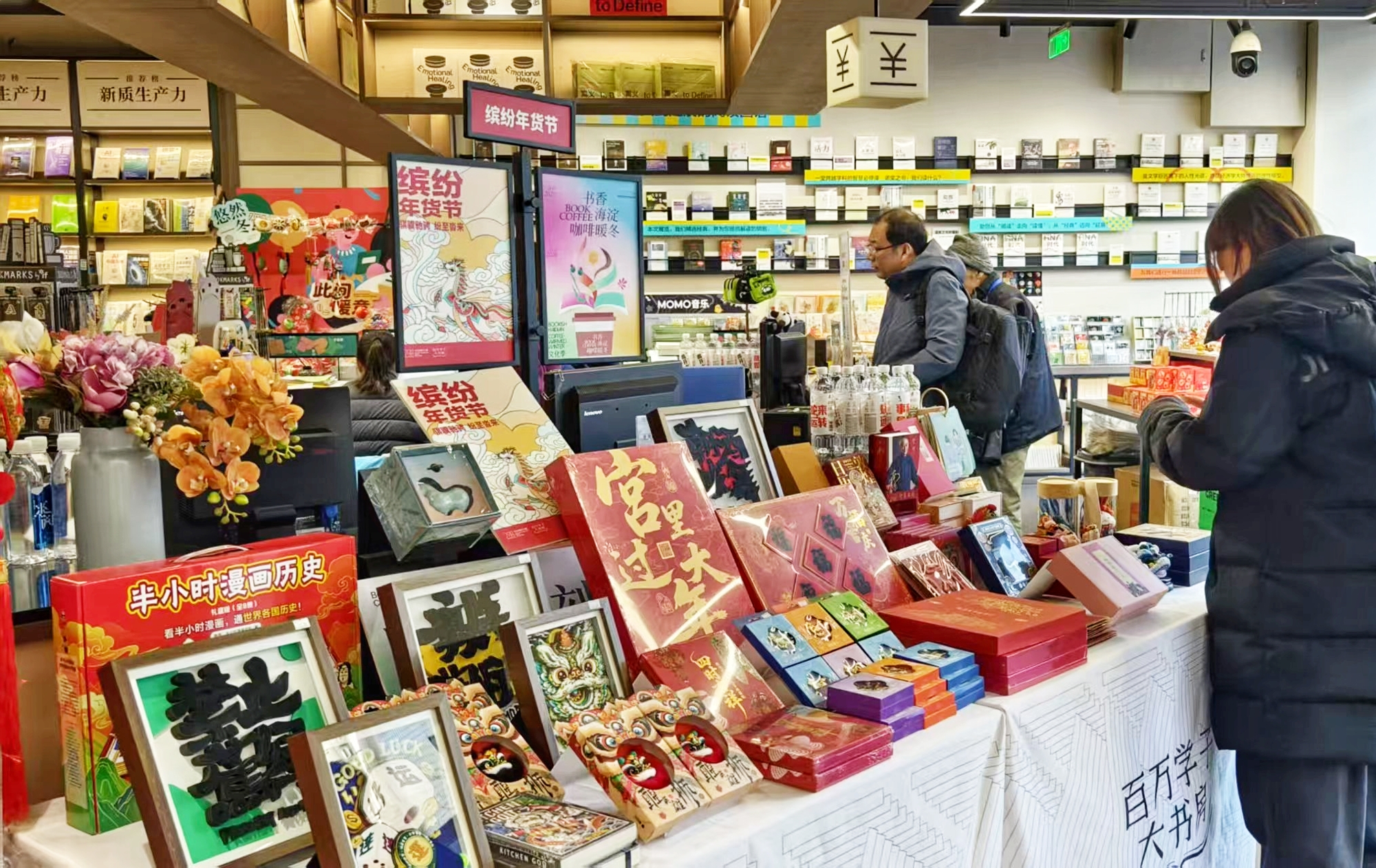 “书香伴年味,文化润京城”,首文科旗下北京发行集团中关村图书大厦打造的“缤纷年货节”正在进行中,为年货节特别打造的特色展台前,读者们纷纷挑选心仪的书香年货,春联、福字、马年文创外,更有好书吸引着读者的目光。