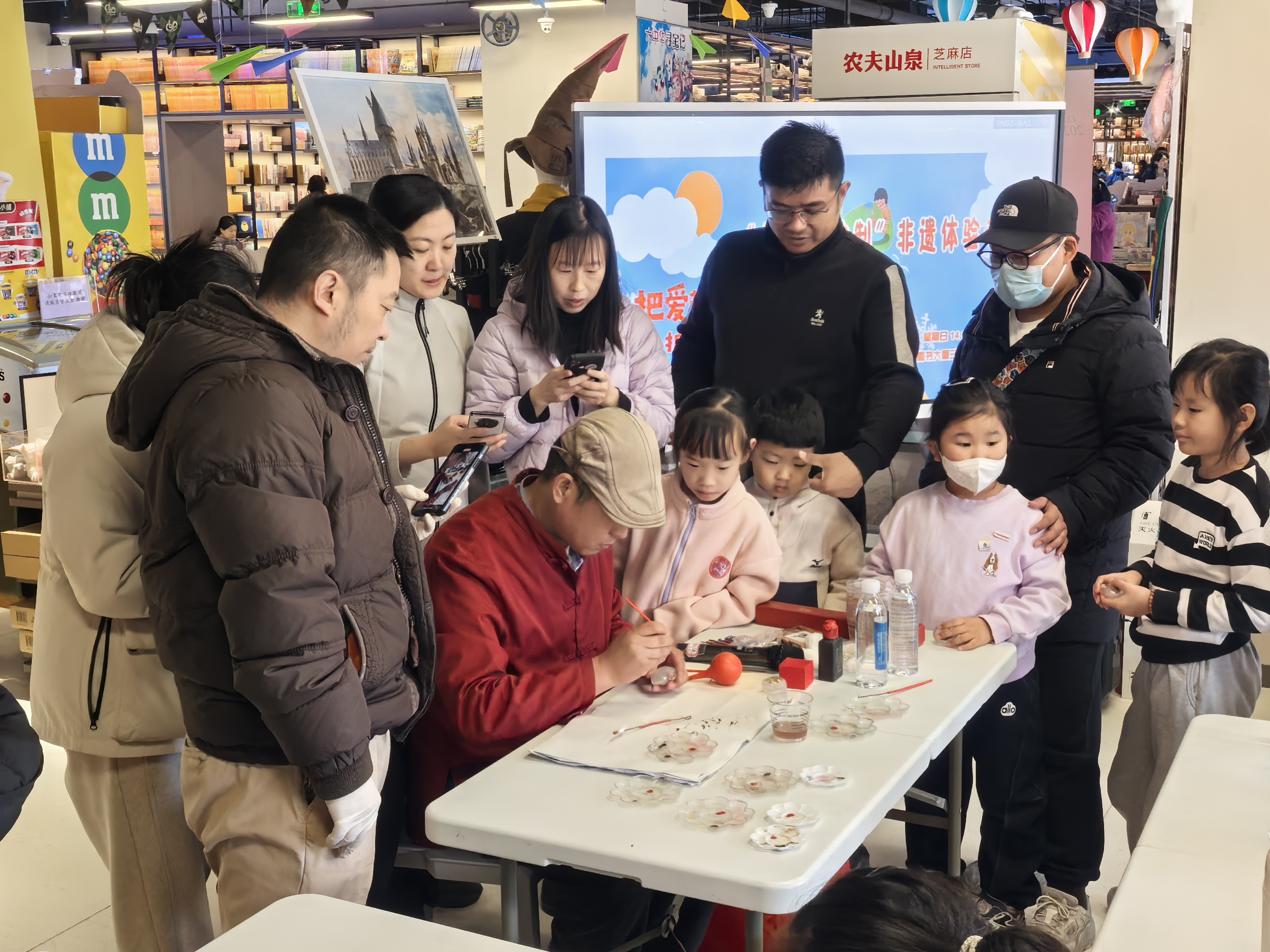 这一天,亲子家庭到书店里体验非遗,乐趣多多。非遗体验作为中关村图书大厦“缤纷年货节”的一部分,已经举办了三期,正在进行的“鼻烟壶绘制”非遗体验专场吸引了30个家庭的参与。“这笔和我们平时用的笔不一样,这叫钩笔,咱们一会儿用钩笔体验勾线、染色。”王宪文专注鼻烟壶内画艺术多年,此时,他正在给孩子们耐心示范,“我先画一下荷花叶子,咱们完全是反向作画。”