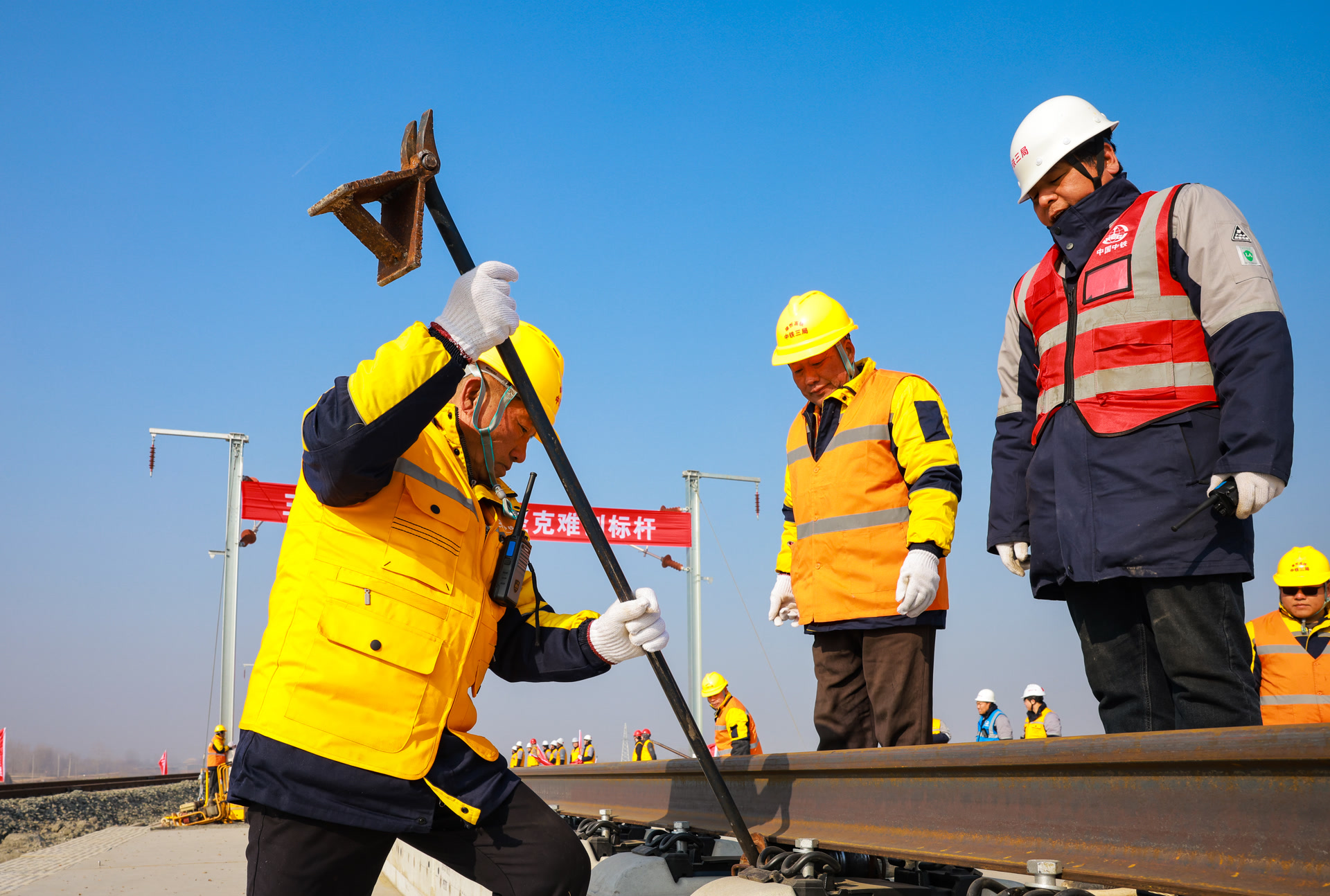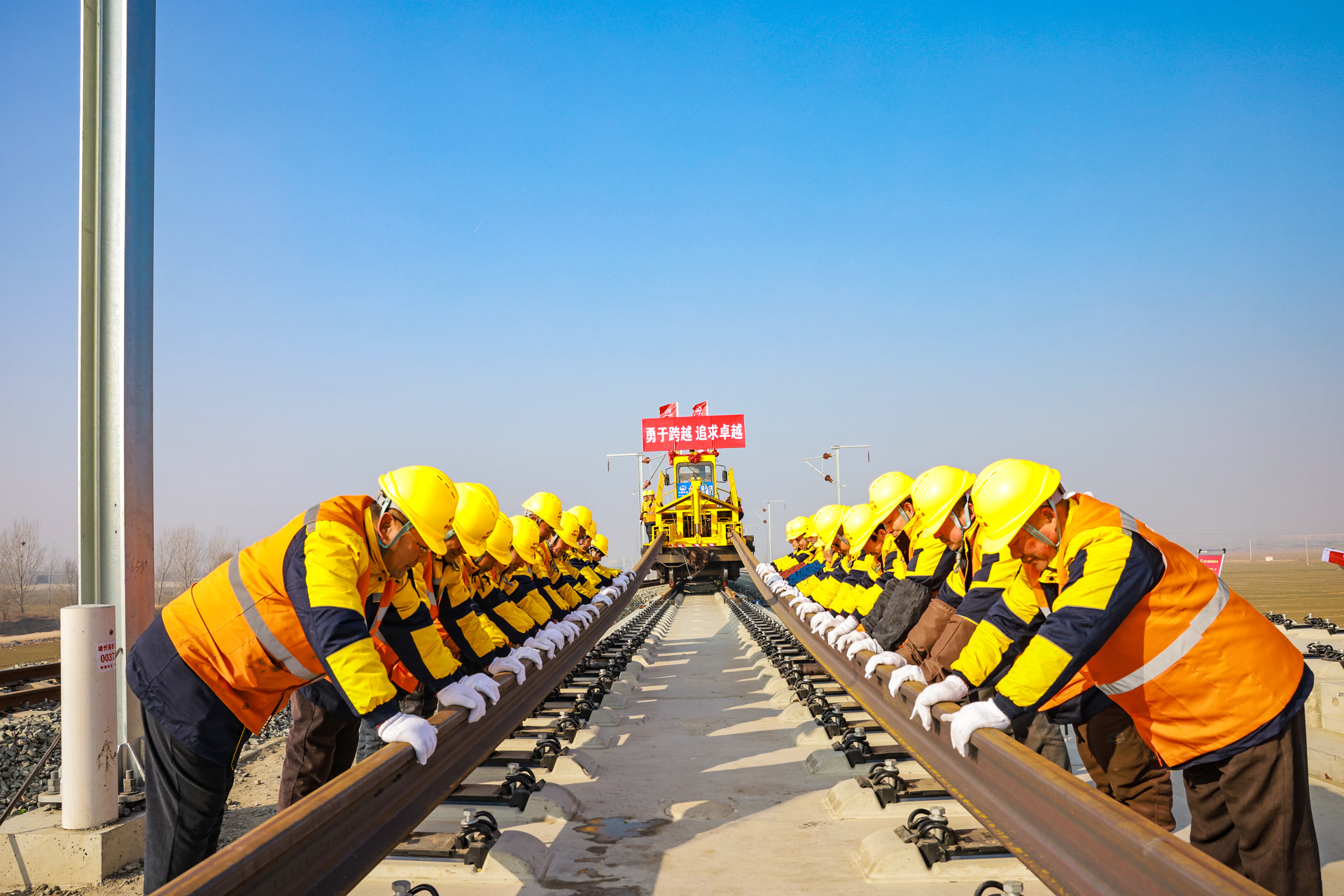 2月1日上午,河北省保定市顺平县,雄忻高铁跨京广铁路特大桥上,随着首对500米长钢轨平稳、精准铺设在无砟道床,雄忻高铁正式进入铺轨施工阶段。