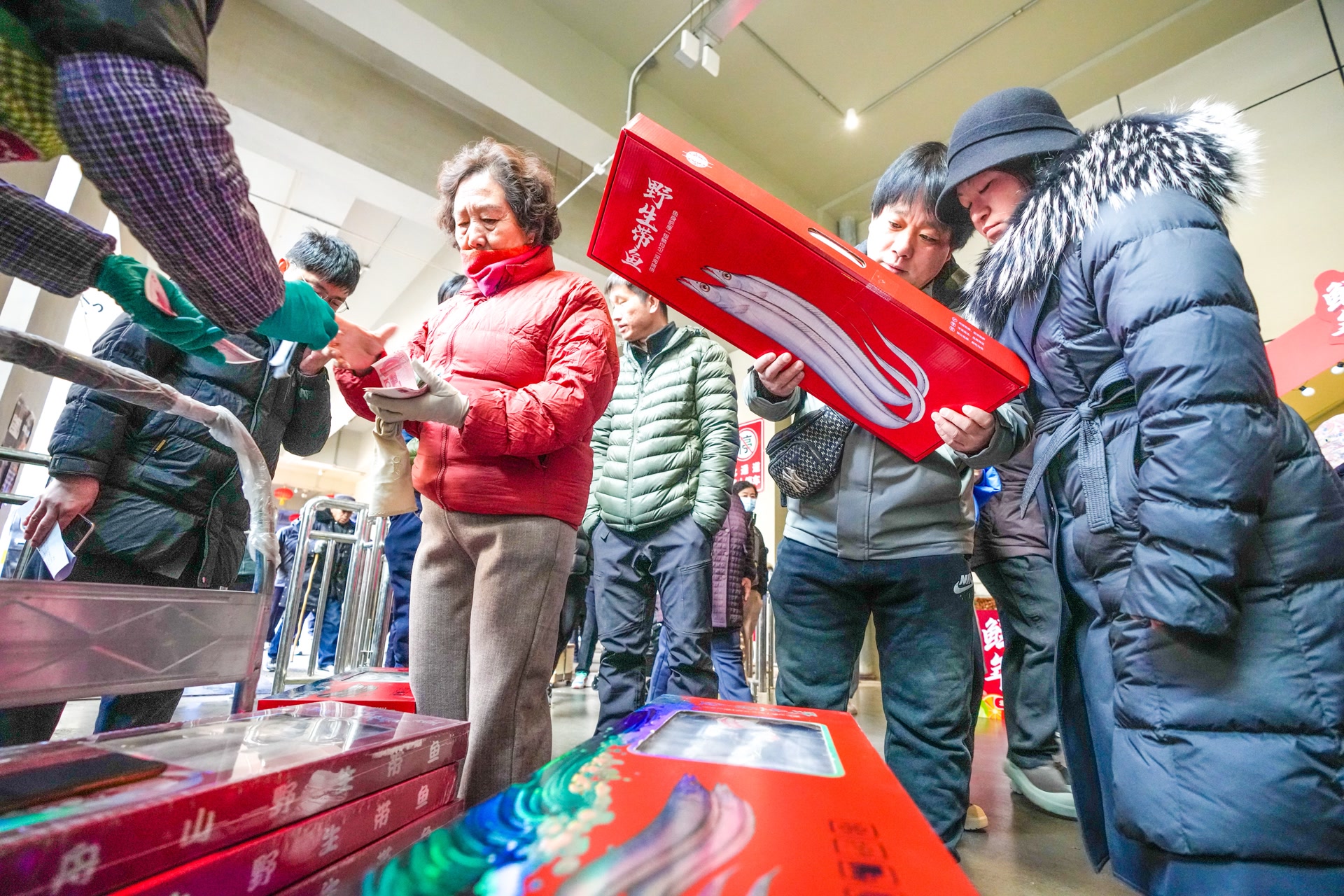 带鱼是许多北京人过年不可或缺的主打菜。记者在现场看到,冻品带鱼也成为市集上最走俏的年货。家住丰台区玉泉营附近的老周和老伴儿,一口气就买了7盒带鱼,准备两盒自家留着炸着吃,其他几盒送亲戚朋友。老周说,过去他一直在西南郊市场买带鱼,市场搬迁到流通中心后,这次是特意来市场置办年货,没想到偶遇一场年货市集,“瞧这带鱼,80元钱一盒,净重8斤多。”