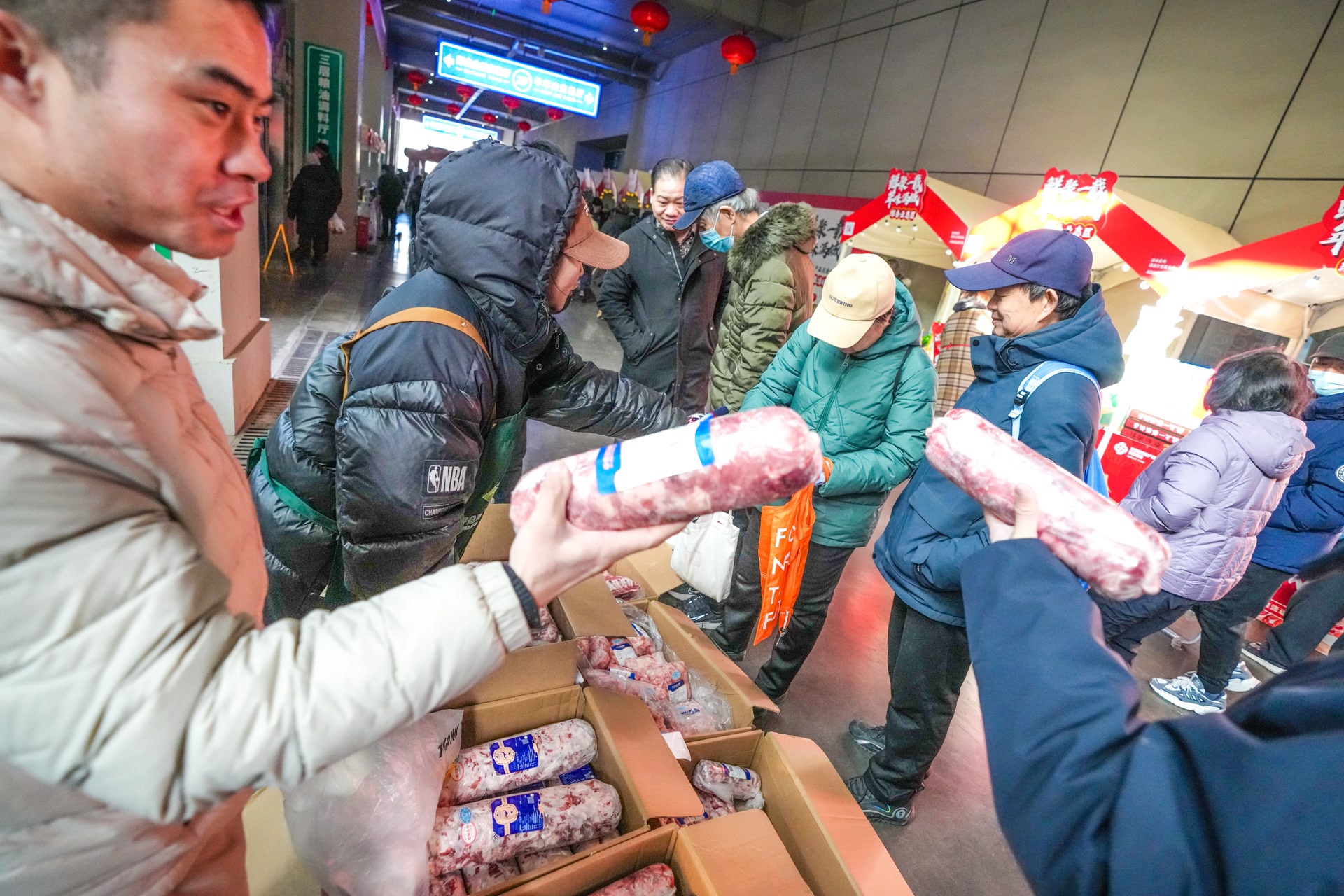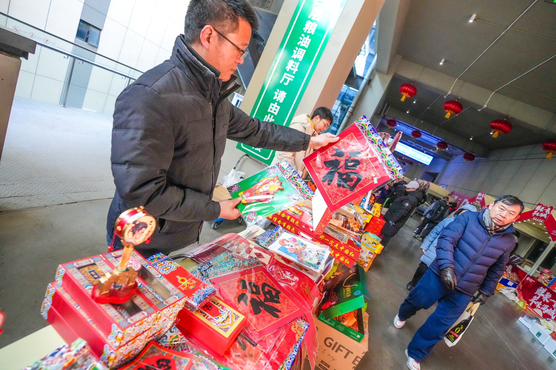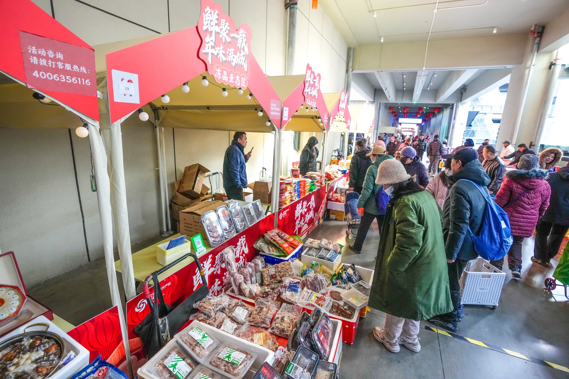 交易大厅二层,一条500米长的步行街上方高高挂起一排排大红灯笼,街两侧,百余家商户的摊位一字排开,米面粮油、调料干货、坚果零食、海鲜水产、肉类冻品,一应俱全。记者在现场看到,市集里人来人往,吆喝声、讲价声此起彼伏——这热闹劲儿,过年的氛围一下子就有了。