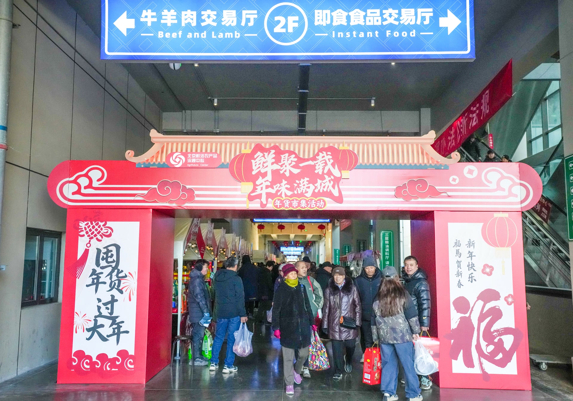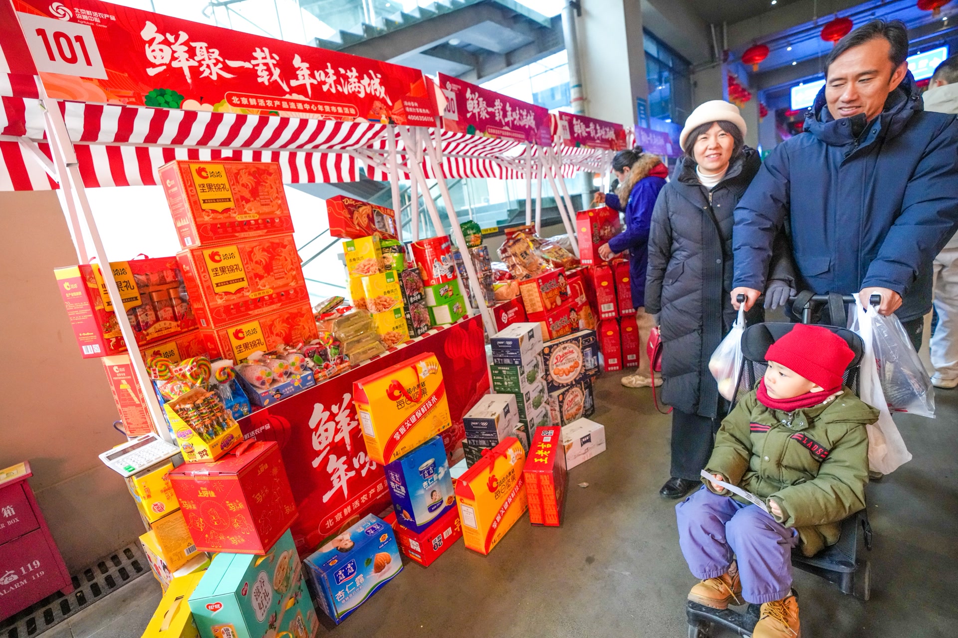 这是北京鲜活农产品流通中心首次办年货市集,也是春节保供的新尝试。北京鲜活农产品流通中心事业部经理袁兵告诉记者,年货市集将一直持续到2月14日,即农历腊月二十七。市场现有1500余家商户,商品种类过万,来自全国乃至全球各地。除年货市集外,蔬菜肉类、酒水茶叶、包装食品、对联福字等各类年货,都能在交易大厅里的各个档口一站式购齐。