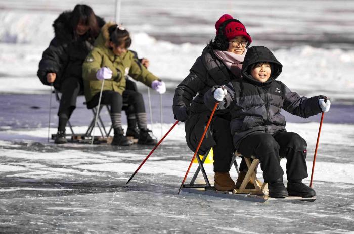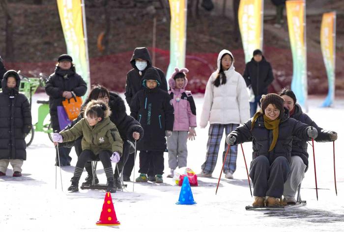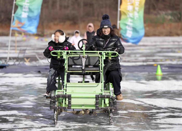 青少年体验亲子冰车接力赛。