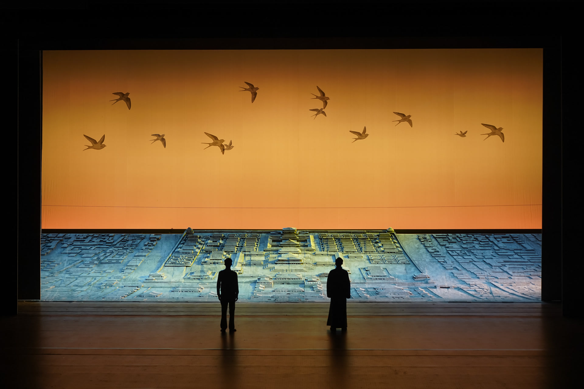 但当年时局纷乱,“除了测绘成果,留下的记载非常少,我们几乎没有找到什么资料。”唐凌和其他主创艺术家用了大量时间查阅资料,了解艰深复杂的建筑学和当时北平的社会氛围,尝试把历史遗留的些许文字一点点还原为剧作中丰富立体的众多角色。在更加抽象凝练的层面,常常盘旋在中轴线古建筑间的雨燕,成为提挈全剧的精神符号——测绘队员捡到的小燕儿,即北京雨燕,是唯一以“北京”命名的野生候鸟,一生几不落地,“从生至死,永不懈怠,而无论飞得多远,它们最后一定要回到北京城。”雨燕无畏风雨、执着回归的特质,与建筑人在至暗岁月的艰难守望巧妙相合,这个轻盈灵动的形象,为底色沉郁厚重的《雨燕》注入了一抹蓬勃向上、充满希望的亮色。