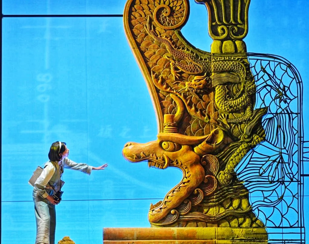 王琛透露,舞台上关键的古建筑构件均严格按照1:1的真实比例复原制作,当它们悬置于观众面前,一种视觉上的“压迫感”油然而生,“观众能直观体会到剧中人物每日工作的物理尺度和精神重量,体会测绘队员是以怎样的血肉之躯攀爬、丈量并试图挽留这份巍峨的文明。”舞台地面,北平时期中轴线的建筑脉络化为起伏线条,如纸张般弧形掀起,“寓意着古城文明在战火中飘摇欲飞却又根基深植的命运。建筑的‘实’代表文明遗产,图纸的‘虚’代表传承意志,虚实明暗的衔接过渡,共同凝固了那段惊心动魄的历史。”