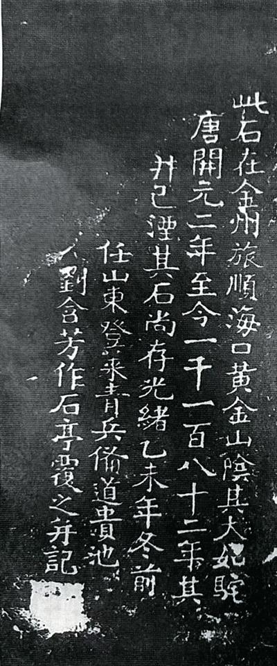 根据《总汇》梳理的“唐鸿胪井碑大事记”,1911年,乔德秀在《南金乡土志》中记载了“鸿胪井”词条:“唐贞观年鸿胪崔忻所凿,在旅顺口黄金山之北麓,刻字于石上。其石今为日本汽船载去。”
