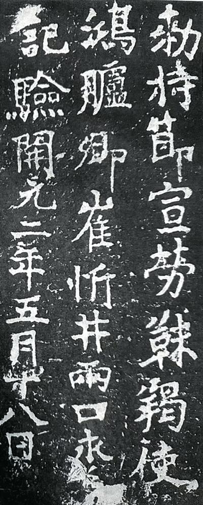 为了纪念这一重大历史事件,崔忻在返回长安途中于旅顺黄金山南麓及西北麓各凿井一口,并在西北麓井旁一块“其大如驼”的巨石上铭刻3列29字:“勑持节宣劳靺羯使鸿胪卿崔忻井两口永为记验开元二年五月十八日”。该铭刻位于碑石左上部,面积大约纵35厘米、横14厘米。这就是唐鸿胪井及鸿胪井碑(又称鸿胪井刻石)。据日本海军省档案《唐碑略图》附记和日本学者渡边谅实际测量的数据:整个碑石宽3米,厚2至2.5米,高1.7至1.8米,重约9.5吨。