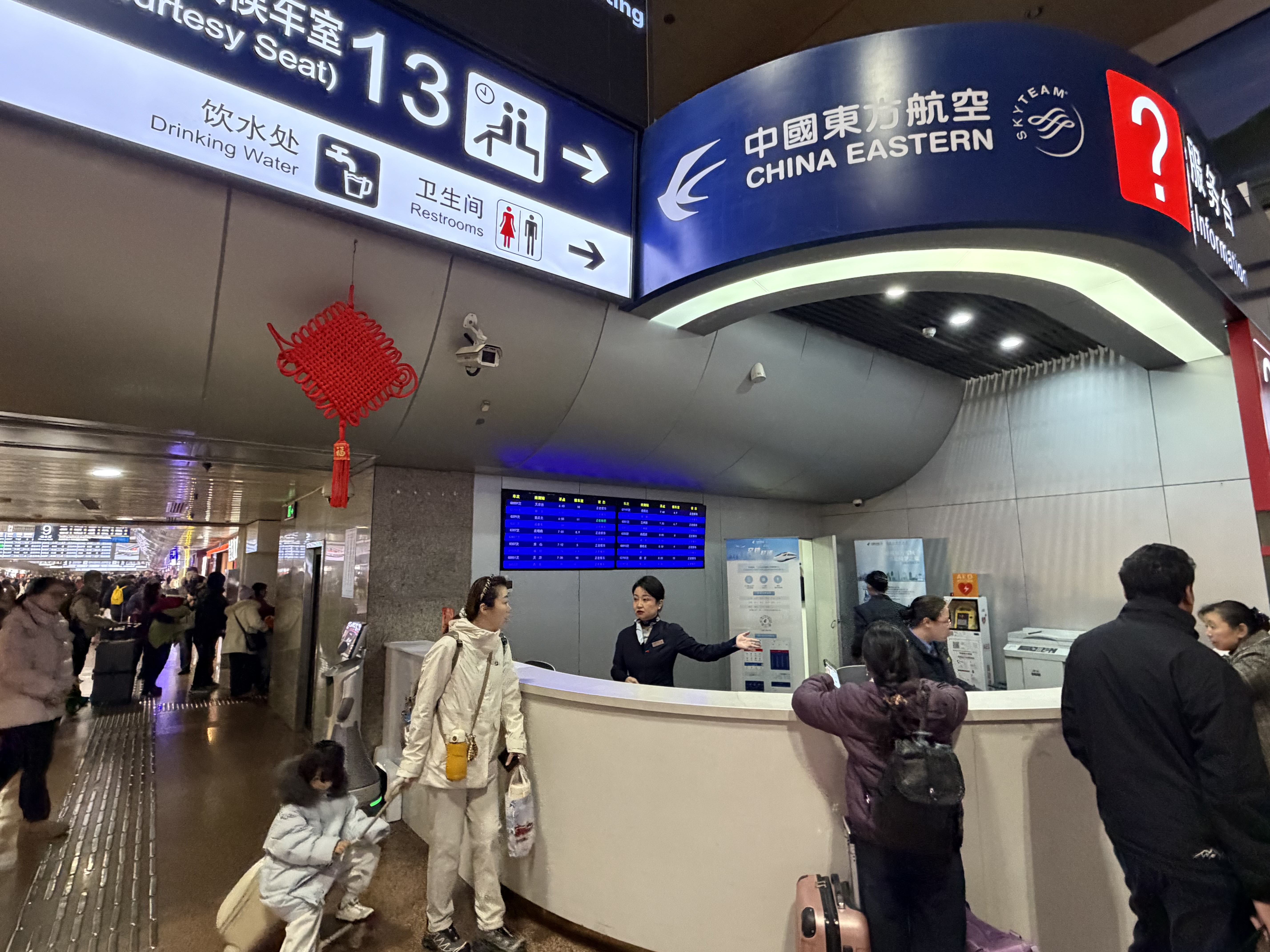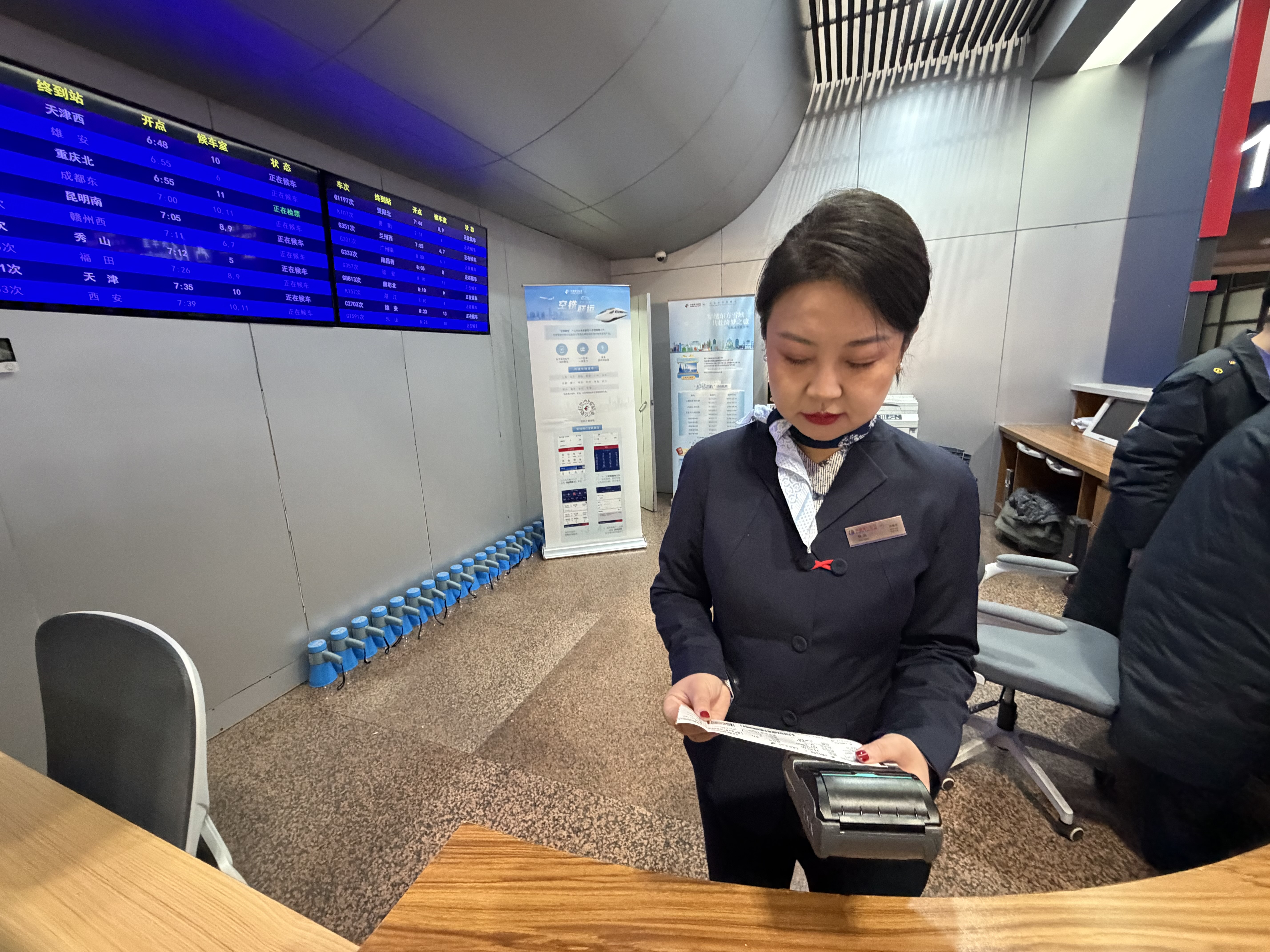 2月2日春运首日,北京西站南二楼12306服务台旁,中国东方航空公司值机柜台正式启用。今天一早,已有东航工作人员在柜台前值守,为从大兴机场出发的东航旅客办理值机业务。未来,该服务柜台将逐步实现“票务联售、服务联程、安检互认、行李直挂”全流程服务,旅客可以在北京西站办理行李托运,轻装简行前往机场。