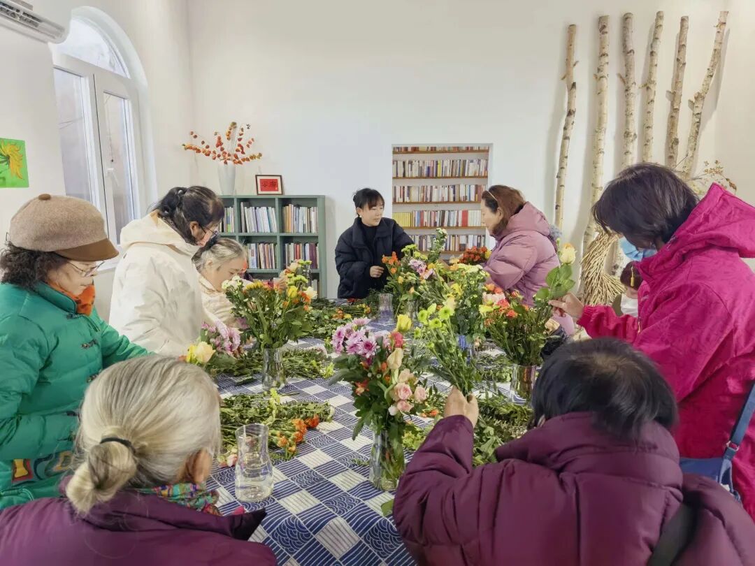 “莳光花社”里,向日葵画作映衬着翠绿绿植,残疾人学员正跟着老师学习园艺技巧,“以后自家小院也能种上这些花”;相邻的“人民书屋”中,人民出版社捐赠的3000册图书整齐排列,“梁上燕”主题与葫芦文创相映成趣,几位视障居民正用触觉感受书籍的温度;“拾味小馆”的“小厨房”里,专业老师正示范咖啡拉花技巧,“学会了就能自己开店”的期盼写在学员们脸上。更令人暖心的是“杏巷小屋”,二十四节气墙下,鼓楼中医院的专家正在教授八段锦,北京中医药大学捐赠的养生工具让康复训练更具专业性。