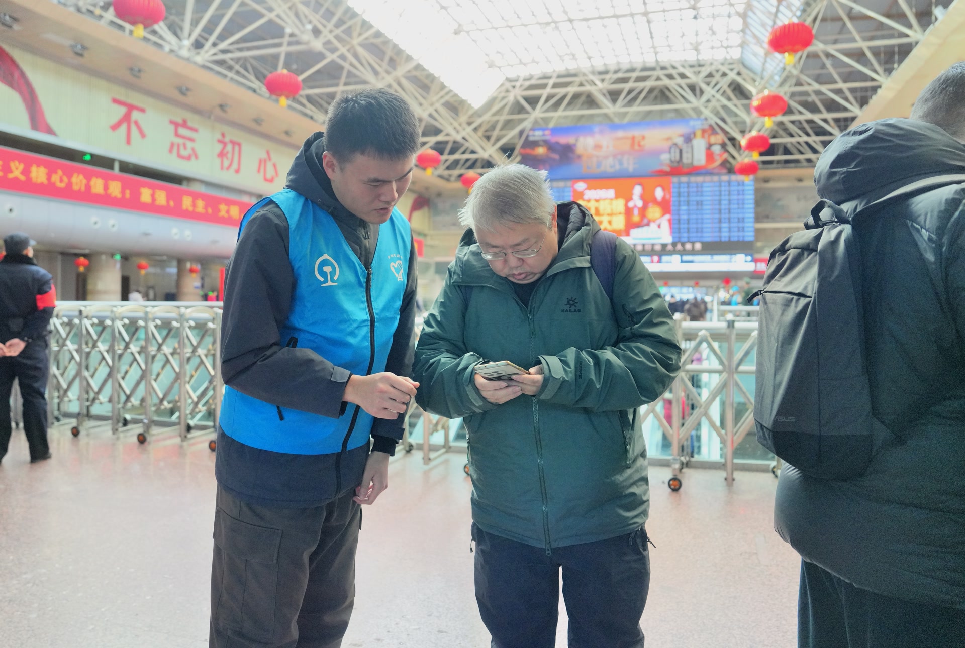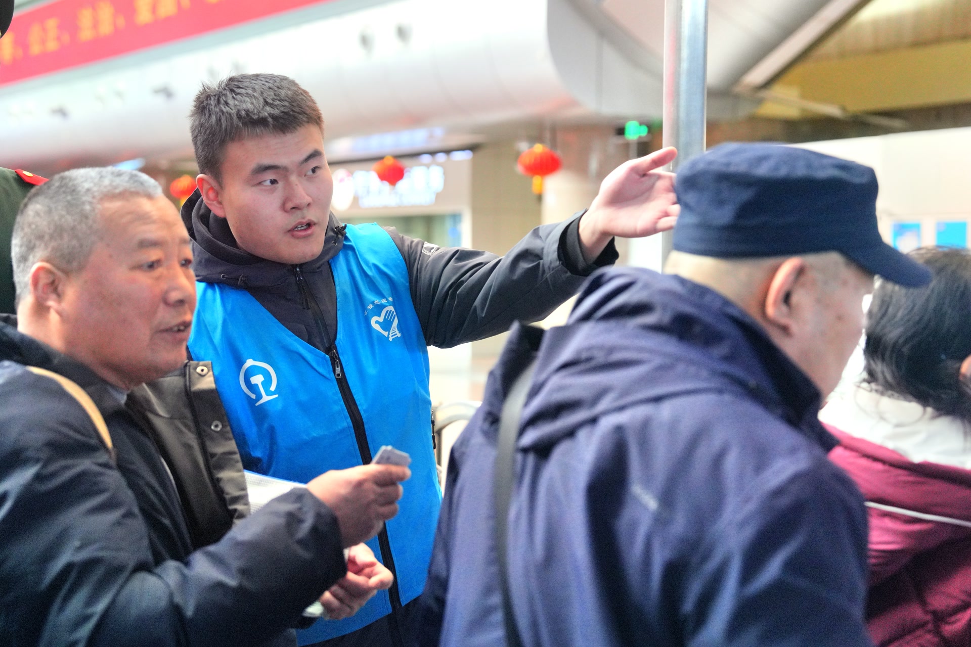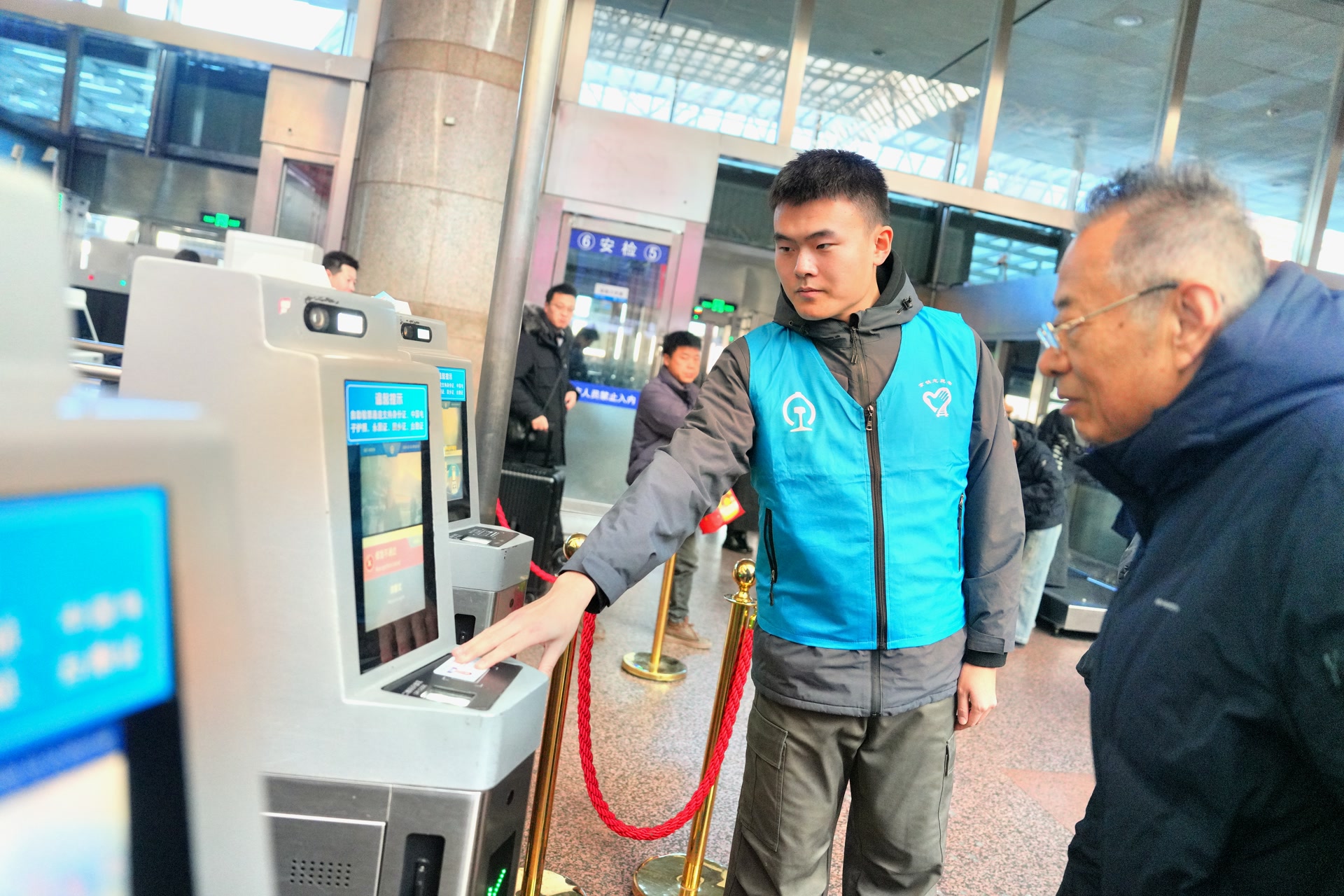 蒋戈乐一边引导旅客有序刷身份证,一边抬头四处打量。突然,他走进人群,精准锁定两位年轻旅客,隔着三五个人就大声询问:“怎么了?需要帮忙吗?”