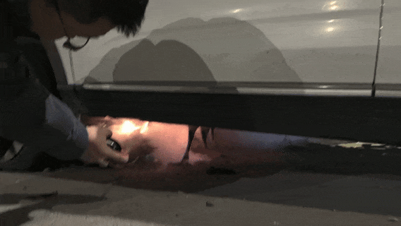 二人赶到时,电动汽车倒在路边,伤者躺在地上。更危急的是,电动汽车引擎盖下已蹿出火苗。