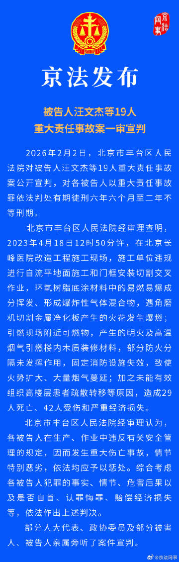 2026年2月2日,北京市丰台区人民法院对被告人汪文杰等19人重大责任事故案公开宣判,对各被告人以重大责任事故罪依法判处有期徒刑六年六个月至二年不等刑期。