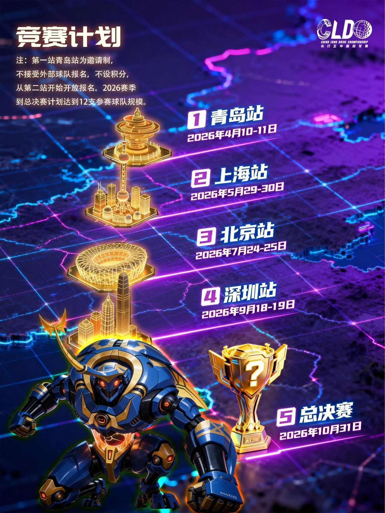 2026年4月中旬,联赛揭幕战将于青岛率先举行。首站已邀请青岛、北京、深圳等六支代表城市战队参赛。